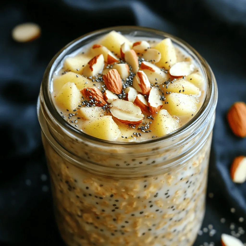 - 1 cup rolled oats - 1 cup almond milk (or any milk of choice) - 1 medium apple, peeled and diced - 1 tablespoon chia seeds To make apple cinnamon overnight oats, you need a few key items. Rolled oats are the base. They soak up all the flavors well. Almond milk adds creaminess. You can use any milk you like. Diced apple gives a nice crunch and sweetness. Chia seeds add a healthy boost and help the oats thicken. - 1 teaspoon ground cinnamon - 1 tablespoon maple syrup (or honey) - 1/2 teaspoon vanilla extract - A pinch of salt Now, let's talk about flavor. Ground cinnamon brings warmth and spice. Maple syrup or honey adds sweetness. Vanilla extract enhances the flavor, making it richer. A pinch of salt balances all the tastes, keeping your oats from being bland. - Sliced almonds - Additional apple slices - Nutmeg Toppings are where you can get creative. Sliced almonds add crunch and protein. Extra apple slices make it look pretty. A sprinkle of nutmeg gives a warm, cozy aroma. You can mix and match these toppings to fit your mood each morning. Start by grabbing a large mixing bowl. In this bowl, combine 1 cup of rolled oats, 1 tablespoon of chia seeds, 1 teaspoon of ground cinnamon, and a pinch of salt. Mix these dry ingredients well. This step builds a solid base for your oats. Chia seeds add extra fiber and keep you full longer. Now, take another bowl. Whisk together 1 cup of almond milk, 1 tablespoon of maple syrup, and 1/2 teaspoon of vanilla extract. Make sure everything blends nicely. Almond milk gives a creamy texture, while maple syrup adds a touch of sweetness. Pour the wet mixture over the dry ingredients. Stir until all the oats are coated. Next, gently fold in 1 medium apple, peeled and diced. Make sure the apple pieces are spread out in the mix. This adds a fresh crunch to your oats. Transfer the mixture to a jar or a tightly-sealed container. Place it in the fridge overnight, or for at least 4 to 6 hours. This allows the oats to soak up the flavors. The next morning, take the oats out and stir well. If you want creamier oats, add a splash more almond milk. Serve in bowls and top with your favorite add-ons like sliced almonds, extra apple slices, or a sprinkle of nutmeg. Enjoy your healthy, tasty breakfast! To get creamy overnight oats, the right liquid amount is key. For creaminess, add more almond milk. Start with the 1 cup in the recipe. If it feels too thick, just stir in a bit more milk until you get the texture you like. Soaking time matters too. Aim for at least 4-6 hours in the fridge. This lets the oats absorb the liquid and soften. For the best results, overnight soaking works great! Want to spice things up? Add more cinnamon if you love its warm taste. You can also try a pinch of nutmeg or a dash of ginger. These spices mix well with apple and give your oats a tasty twist. If you want a different sweet kick, swap out maple syrup for honey or use agave syrup. Each sweetener adds a unique flavor that can change your whole dish! You can prepare these oats up to 3 days in advance. This makes mornings easier! Just store them in the fridge until you are ready to eat. For freshness, use a tightly-sealed jar or container. This keeps them from drying out. If you notice the oats thickening too much, stir in a little milk right before serving. Enjoy your delicious, easy breakfast! {{image_2}} You can switch out apples for other fruits. Bananas or berries work great. Slice ripe bananas and mix them in. Blueberries or strawberries add a juicy touch. You can also try seasonal fruits. In fall, pears add a sweet twist. In summer, fresh peaches bring a juicy flavor. Adding nuts and seeds boosts nutrition. You can use walnuts or pecans instead of almonds. Both add crunch and healthy fats. For even more nutrients, add seeds. Try pumpkin seeds or sunflower seeds. They add texture and flavor. You can change the taste by adding spices. Try nutmeg or ginger for warmth. These spices complement the apple and cinnamon well. If you love chocolate, mix in cocoa powder. It gives a unique twist and makes it even tastier. To keep your Apple Cinnamon Overnight Oats fresh, always store them in the fridge. Use a clean, airtight container. This helps to lock in flavors and moisture. They will stay good for up to five days. I recommend making a batch at the start of the week. It makes breakfast a breeze! Yes, you can freeze overnight oats! Freezing is a great way to save extra servings. Use freezer-safe containers or jars. To thaw, move them to the fridge overnight. You can also warm them in the microwave. Just add a splash of almond milk to restore creaminess. The best containers are glass jars or BPA-free plastic containers. Look for ones with tight-fitting lids. An airtight seal keeps the oats fresh longer. Avoid using containers that let air in. This will help prevent spoilage and keep your oats tasty! The best oats for overnight oats are rolled oats. They soak up liquid well and stay soft. Instant oats can become mushy, while steel-cut oats need longer to soften. Rolled oats give you a nice, creamy texture that's just right. Yes, you can easily make this recipe vegan. Just use almond milk or any plant-based milk you like. Maple syrup is a great sweetener that fits well in vegan diets. This way, you keep all the yummy flavors while staying plant-based. To make more servings, just double or triple the ingredients. For example, use 2 cups of rolled oats and 2 cups of almond milk for four servings. Keep the other ingredients in the same ratio. This makes it easy to serve family or friends. Yes, overnight oats can last up to 4-5 days in the fridge. Just keep them in an airtight container. If they smell off or look strange, throw them away. Freshness is key to enjoy the taste and texture. Absolutely! You can heat up your overnight oats if you prefer them warm. Just pop them in the microwave for about 30-60 seconds. Stir well and check the temperature before you eat. You can also add a splash of milk t