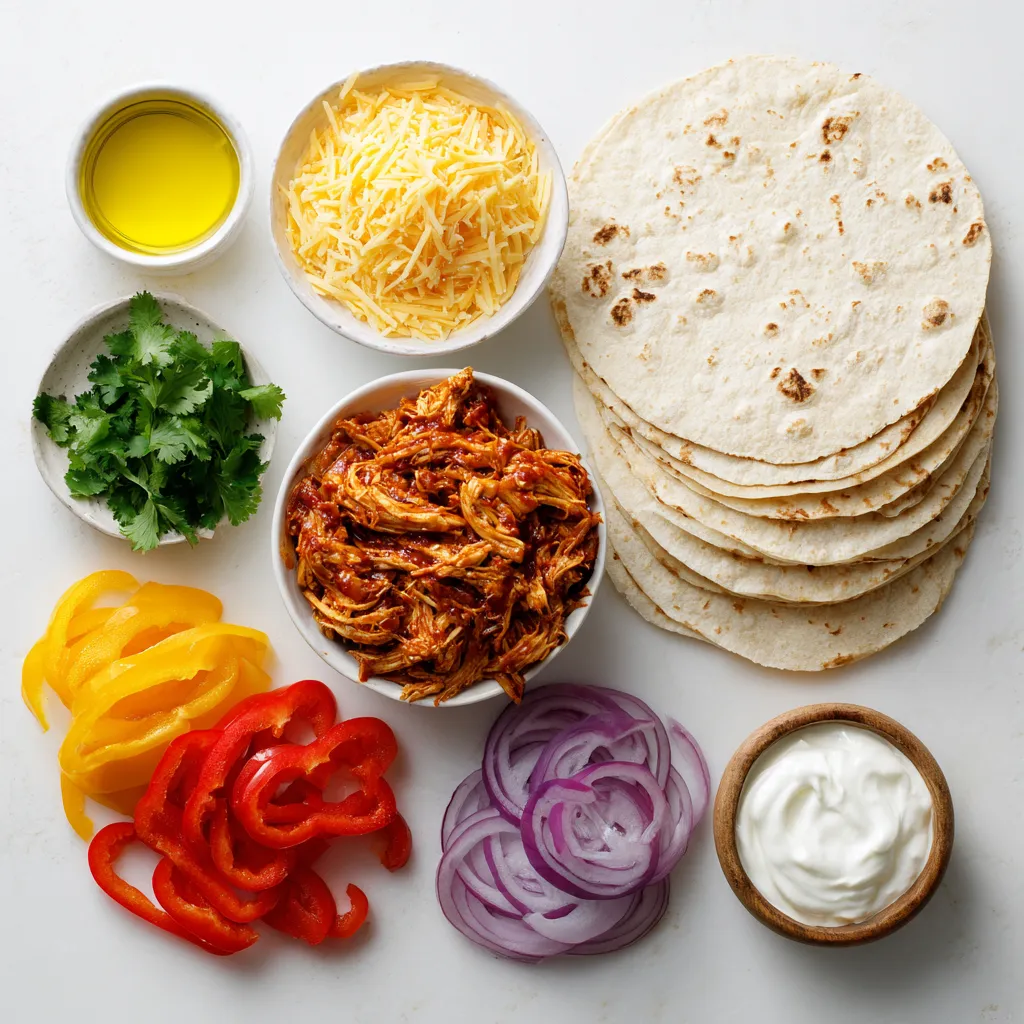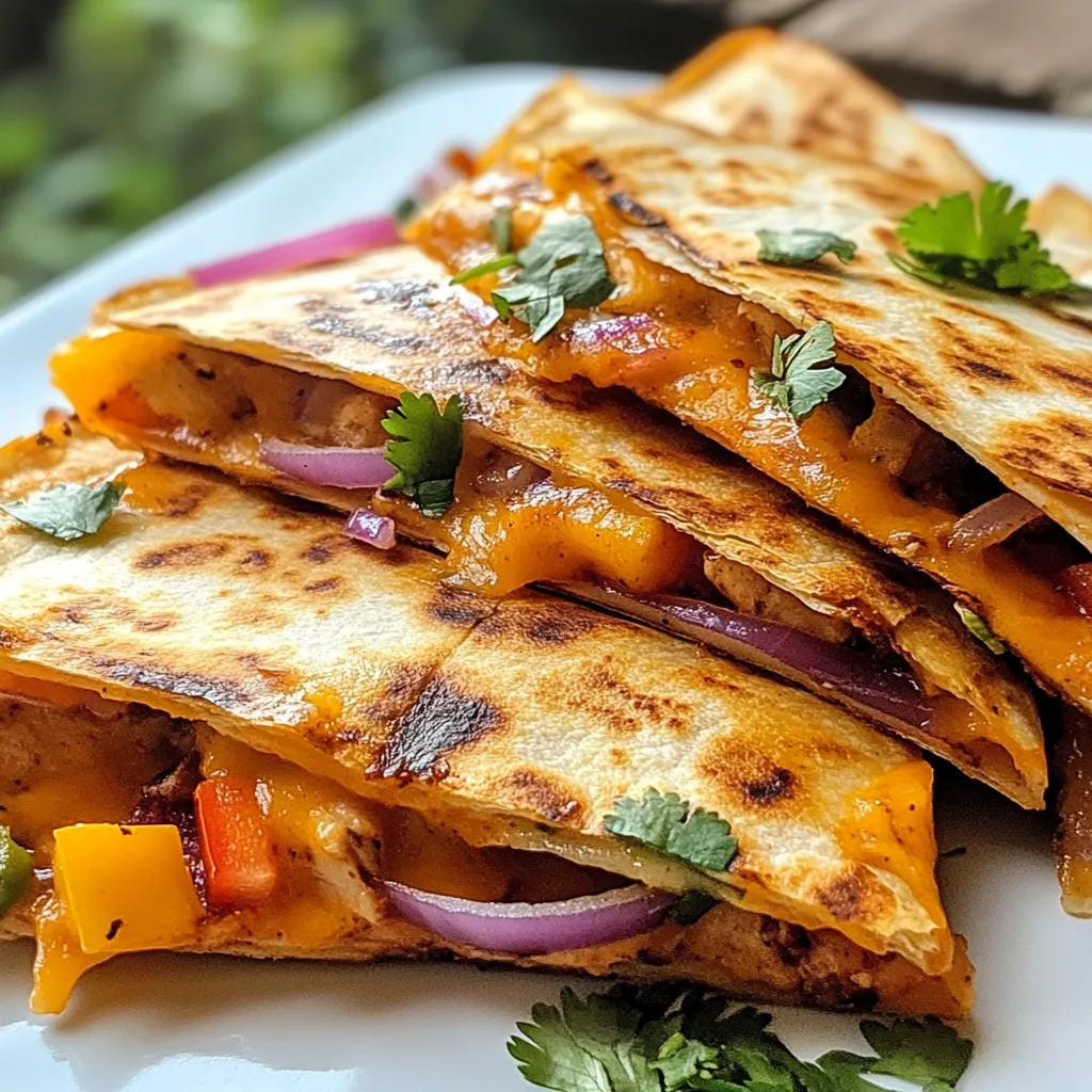 - 2 cups cooked chicken, shredded - 1 cup BBQ sauce (your favorite brand) - 1 cup shredded cheddar cheese - 1 cup shredded mozzarella cheese - 8 whole wheat or flour tortillas - 1/2 cup red onion, thinly sliced - 1/2 cup bell peppers (any color), sliced - 1 tablespoon olive oil - Fresh cilantro for garnish - Sour cream or Greek yogurt for serving (optional) Use a BBQ sauce that you enjoy. It adds a lot of flavor. Choose a sauce with balanced sweetness and spice. Some brands are sweeter, while others are tangy or smoky. Try a few to find your favorite. Look for natural ingredients in sauces for better taste. If you want, use rotisserie chicken instead of cooking your own. You can also swap out the cheeses. Pepper Jack cheese adds a spicy kick. For a lighter option, use corn tortillas. If you like veggies, add spinach or mushrooms. These changes can make your quesadillas unique! {{ingredient_image_1}} 1. Start by mixing the shredded chicken and BBQ sauce in a bowl. Make sure all the chicken gets coated with the sauce. 2. Slice the red onion and bell peppers thin. This will help them cook fast. 1. Heat a large skillet over medium heat. Add the olive oil and let it warm up. 2. Add the sliced onions and peppers to the skillet. Cook for 3-4 minutes until they soften. 3. Take a tortilla and spread the BBQ chicken mix on half of it. 4. Sprinkle a mix of cheddar and mozzarella cheese on top of the chicken. 5. Fold the tortilla to make a half-moon shape. Place it in the skillet. 6. Cook for about 3-4 minutes on each side. Look for a golden brown color and melted cheese. 7. Repeat this with the rest of the tortillas. 8. Slice the quesadillas into wedges and sprinkle with fresh cilantro. 9. Serve with sour cream or Greek yogurt if you like. - Keep the heat at medium to avoid burning the tortillas. - Use a spatula to press down on the quesadilla for even cooking. - Let the quesadillas rest for a minute before slicing. This helps keep the cheese inside. - Experiment with different BBQ sauces to find your favorite flavor! To get crispy quesadillas, use medium heat. Too high heat burns them. Use enough oil in the pan to coat it well. This keeps the tortillas from sticking. Flip them carefully to avoid spilling the filling. Cook each side for about 3-4 minutes. Wait until they turn golden brown for the best crunch. For this recipe, I love using cheddar and mozzarella. They melt well and add great flavor. You can also try pepper jack for a little heat. If you want more depth, add some gouda. Mixing cheeses gives you a nice blend of taste and texture. Season your filling to boost flavor. I suggest adding garlic powder and onion powder. A touch of cumin adds warmth. If you like a kick, try some chili powder. Fresh cilantro is great too; add it right before serving. This makes your quesadillas pop with flavor! Pro Tips Use Leftover Chicken: This recipe is perfect for using up leftover rotisserie chicken or any cooked chicken you have on hand, saving time and reducing waste. Customize Your Cheese: Feel free to mix and match your favorite cheeses! Pepper jack or gouda can add an extra kick or unique flavor to your quesadillas. Don’t Overfill: Be careful not to overfill your quesadillas, as this can make them difficult to flip and lead to spills. A good rule of thumb is to use about 1/2 cup of filling per quesadilla. Keep It Warm: If you're making multiple quesadillas, keep the cooked ones warm in a low oven (around 200°F) while you finish the rest to ensure they stay nice and melty. {{image_2}} To add heat, mix in chopped jalapeños with your BBQ chicken. You can also use spicy BBQ sauce. This gives a nice kick. Just be careful; you want to balance the flavors. A little heat goes a long way. You can make a great vegetarian version too. Swap the chicken for grilled veggies. Use a mix of zucchini, mushrooms, and bell peppers. Add BBQ sauce for flavor. Cheese options like cheddar or mozzarella work well here, too. This dish stays tasty and filling without meat. Want to add more? Try black beans or corn. They add texture and flavor. Spread a layer of black beans before the chicken. Corn adds a sweet crunch. This will make your quesadilla more hearty and fun. Experiment with your favorite ingredients for a unique twist! To store leftover quesadillas, let them cool first. Place them in an airtight container. You can also wrap them in foil or plastic wrap. This keeps them fresh for later. Store them in the fridge for up to three days. To reheat, you can use a skillet or microwave. If using a skillet, heat it over medium. Add the quesadilla and cook for a few minutes on each side. This makes it crispy again. If using a microwave, heat for about 30 seconds. Make sure it’s warm throughout. You can freeze quesadillas for a quick meal later. Wrap each one in plastic wrap. Then place them in a freezer bag. They can last for up to three months in the freezer. When you want to eat one, thaw it in the fridge overnight before reheating. The best way to shred chicken is to use two forks. Hold one fork in each hand. Grab a piece of chicken with one fork and pull apart with the other. This method works well for warm or cold chicken. If you have a stand mixer, you can use it too. Place the chicken in the bowl and use the paddle attachment on low speed. It shreds in seconds, making it super easy. Yes, you can use store-bought BBQ chicken. This saves time and adds great flavor. Just pull apart the chicken and mix it with some extra BBQ sauce. This will help keep it juicy. It’s a quick option for busy days or when you want a fast meal. You can use many cheese types in your quesadillas. Cheddar and mozzarella are classic choices. You can also try pepper jack for some heat. Other good options are gouda, Monterey jack, or even a mix of your favorites. The more cheese, the creamier the quesadillas will be! Yes, you can make BBQ chicken quesadillas ahead of time. Prepare the filling and store it in the fridge. You can also assemble