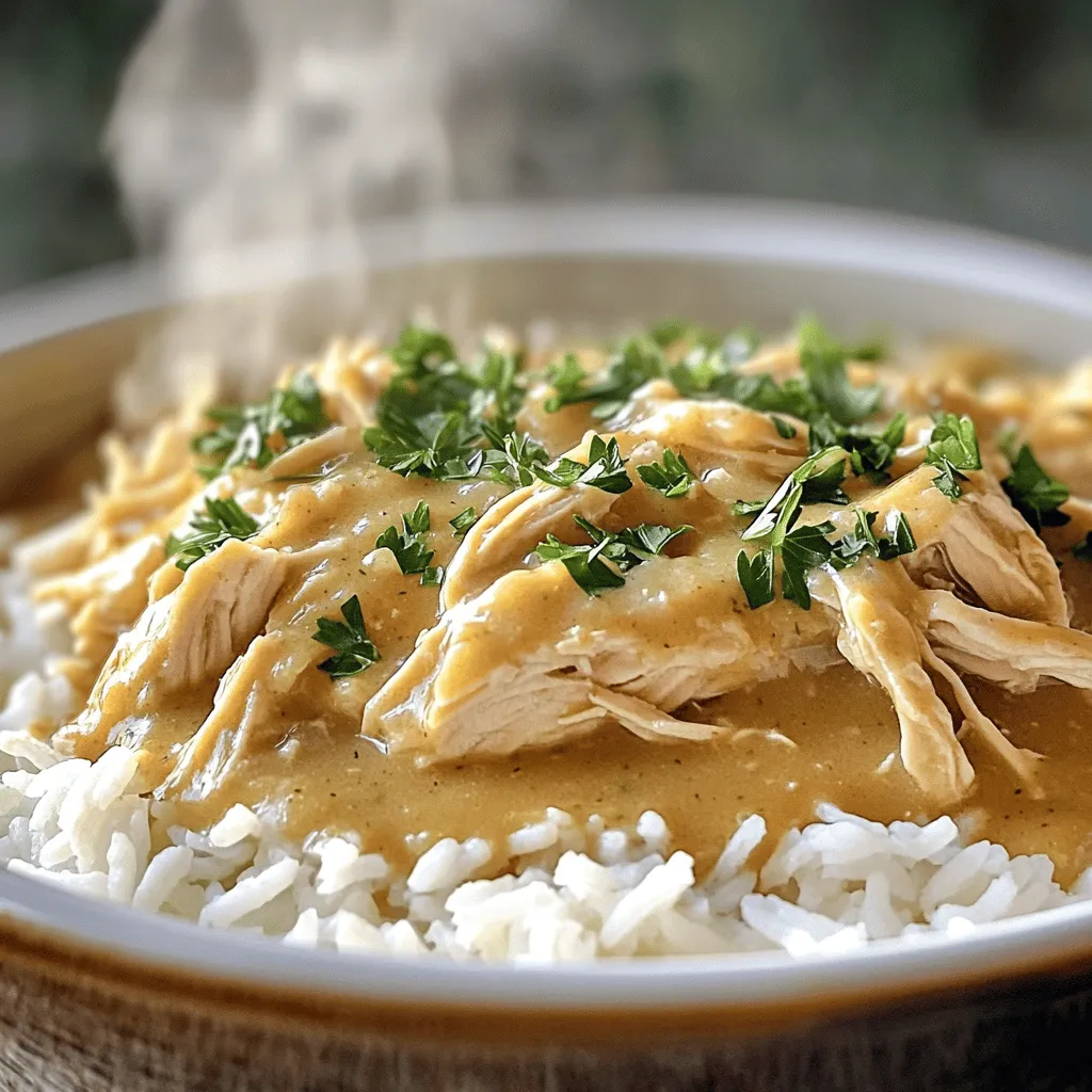 Now it’s time to cook! Cover the crockpot with its lid. Set it on low for 6 to 7 hours or high for 3 to 4 hours. Cooking it low and slow makes the chicken tender and juicy. When it’s done, shred the chicken using two forks. Stir it back into the gravy. This makes every bite delicious. Taste it, and adjust the seasoning if needed. Serve the chicken and gravy over rice or mashed potatoes. Don’t forget to garnish with fresh parsley for color!