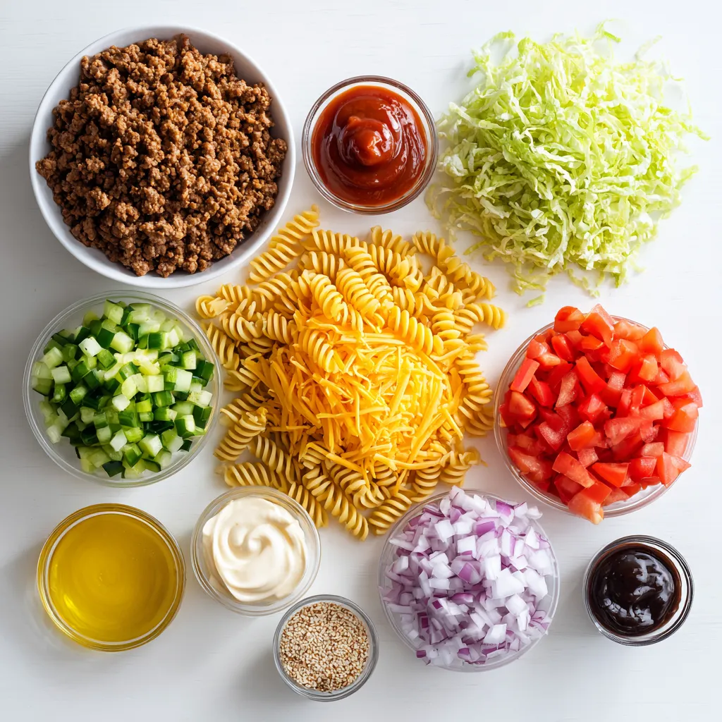 Big Mac Pasta Salad is a fun twist on the classic Big Mac. It has all the flavors we love in a burger but in a pasta form. This salad uses rotini pasta, ground beef, and fresh veggies. It gets its creamy taste from a dressing made with mayonnaise, ketchup, and mustard. This dish brings together comfort food and fresh ingredients in one bowl.