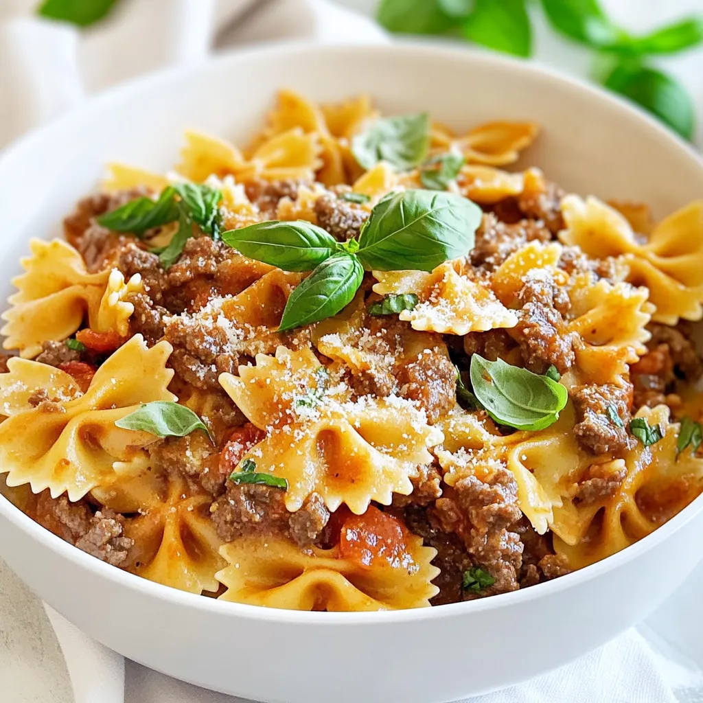 These ingredients create a rich and hearty dish. The bowtie pasta brings a fun shape, while the ground beef adds protein. Onions and garlic give great flavor. Crushed tomatoes and beef broth make a tasty sauce. Oregano and basil bring a nice aroma. Don’t forget the fresh basil and Parmesan for a perfect finish.