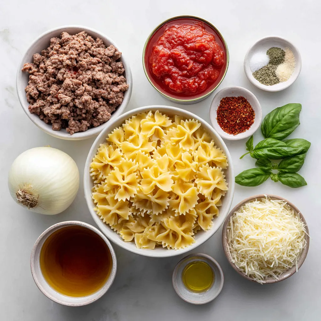 Here’s what you need to make bowtie pasta with ground beef. Gather these fresh ingredients: