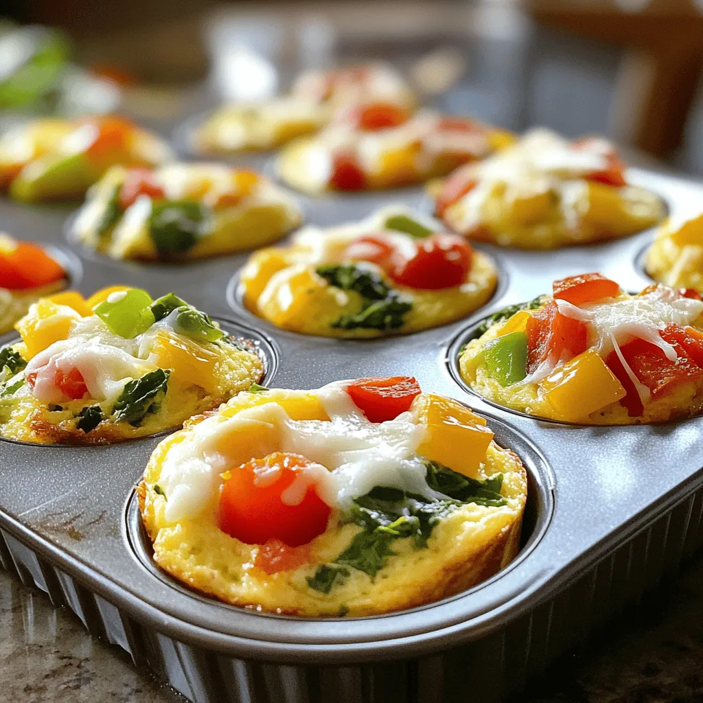 To make tasty breakfast egg muffins, gather these main items: - 6 large eggs - 1/2 cup milk (or a plant-based alternative) - 1 cup spinach, chopped - 1/2 cup bell peppers, diced (red or yellow for color) - 1/2 cup cherry tomatoes, halved - 1/4 cup red onion, finely chopped - 1/2 cup shredded cheese (cheddar or mozzarella) - Salt and pepper to taste These ingredients work well together. The eggs serve as the base. The milk makes them fluffy. The veggies add color and nutrients. You will enjoy the flavors as they blend in the oven. If you want to boost the taste, try these optional seasonings: - 1/2 teaspoon garlic powder - 1/2 teaspoon onion powder These spices add depth and richness. You can mix them in with the other ingredients. Feel free to adjust the amounts based on your taste. You can switch things up with these fun variations: - Meat-filled muffins: Add cooked bacon, sausage, or ham. - Veggie-only muffins: Use other veggies like zucchini or mushrooms. - Cheese and herb combos: Try feta cheese and fresh herbs like dill or basil. These ideas let you customize your muffins. You can create a unique flavor for each batch. Enjoy experimenting to find your favorites! Start by preheating your oven to 350°F (175°C). This step is key for even baking. Next, lightly grease a muffin tin with cooking spray or oil. This helps the muffins pop out easily after baking. Make sure to cover each cup well. Gather all your ingredients and tools. This keeps things organized and makes cooking fun. In a large mixing bowl, crack 6 large eggs. Add 1/2 cup of milk. You can use plant-based milk if you prefer. Whisk these together until they look smooth. Next, stir in 1 cup of chopped spinach and 1/2 cup of diced bell peppers. Then, add 1/2 cup of halved cherry tomatoes and 1/4 cup of finely chopped red onion. Finally, stir in 1/2 cup of shredded cheese. You can pick cheddar or mozzarella. If you like extra flavor, toss in 1/2 teaspoon of garlic powder and onion powder. Season with salt and pepper to taste. Make sure everything is mixed well. Pour the egg mixture into the muffin tin. Fill each cup about 3/4 full. This gives the muffins room to rise. Place the muffin tin in the oven and bake for 18-20 minutes. They are done when they puff up and feel set in the center. After baking, let the muffins cool for a few minutes. Use a silicone spatula or fork to gently remove them from the tin. Enjoy your breakfast egg muffins warm or save them for later! To get the best texture in your egg muffins, follow these tips. First, whisk the eggs and milk thoroughly. This step adds air and makes the muffins fluffy. Use fresh eggs for the best taste. Make sure to fill each muffin cup only 3/4 full. This way, they have room to puff up as they bake. Lastly, let them cool slightly before removing from the tin. This helps keep their shape. You can make these muffins extra tasty with simple add-ins. Try adding cooked bacon or sausage for a meaty kick. Fresh herbs like parsley or basil enhance the taste too. If you want a spicy twist, add diced jalapeños or a dash of hot sauce. For a cheesy boost, mix in feta or goat cheese. Experiment with different veggies like mushrooms, zucchini, or broccoli to find your favorite mix. Using the right tools makes cooking easier. A good non-stick muffin tin helps with easy removal. Silicone spatulas work great for lifting the muffins out. You might also want mixing bowls and a whisk for blending. An oven thermometer ensures your oven is at the right temperature. Using these tools will help you create perfect breakfast egg muffins every time. {{image_2}} You can add meat for extra flavor. Try using cooked sausage, ham, or bacon. Chop the meat into small pieces. Mix it into the egg base along with the veggies. This makes a hearty muffin that keeps you full longer. If you prefer veggies, go all out! Use a mix of your favorites. Zucchini, mushrooms, or kale work well. Just make sure they are chopped small. This version is light and healthy. You can also add spices like paprika for more taste. Cheese adds creaminess and flavor. Try different kinds like feta, goat cheese, or pepper jack. Mix in fresh herbs like basil, parsley, or dill. This gives the muffins a fresh kick. You can experiment with the cheese and herbs to find your favorite blend. To keep your breakfast egg muffins fresh, place them in an airtight container. You can store them in the fridge for up to five days. If you want to keep them longer, freezing is your best option. Make sure they cool completely before storing. When you're ready to enjoy your muffins again, reheating is simple. You can use a microwave or an oven. In the microwave, heat for about 30-45 seconds. Check to see if they are warm. If not, heat for another 15 seconds. For the oven, preheat it to 350°F (175°C) and bake for about 10-12 minutes. This keeps them nice and fluffy. To freeze your breakfast egg muffins, wrap each muffin tightly in plastic wrap. Then, place them in a freezer-safe bag or container. Label the bag with the date. They can last up to three months in the freezer. When you want to eat them, move them to the fridge the night before. This way, they thaw slowly and taste great when reheated. Yes, you can use egg substitutes. Some good options include silken tofu or chickpea flour. Use about 1/4 cup of egg substitute for each egg. This keeps the same flavor and texture in your muffins. It’s a great choice for those who want a plant-based option. Breakfast Egg Muffins last about 4 to 5 days in the fridge. Store them in an airtight container to keep them fresh. Make sure they cool down before placing them in the fridge. This helps prevent sogginess and keeps them tasty. Cheddar and mozzarella are great choices for flavor. You can also try feta for a tangy twist. Goat cheese adds a creamy texture. Mix and match your favorite cheeses to find the perfect combo for your taste buds. Breakfast egg muffins are easy to make and full of flavor. We covered main in