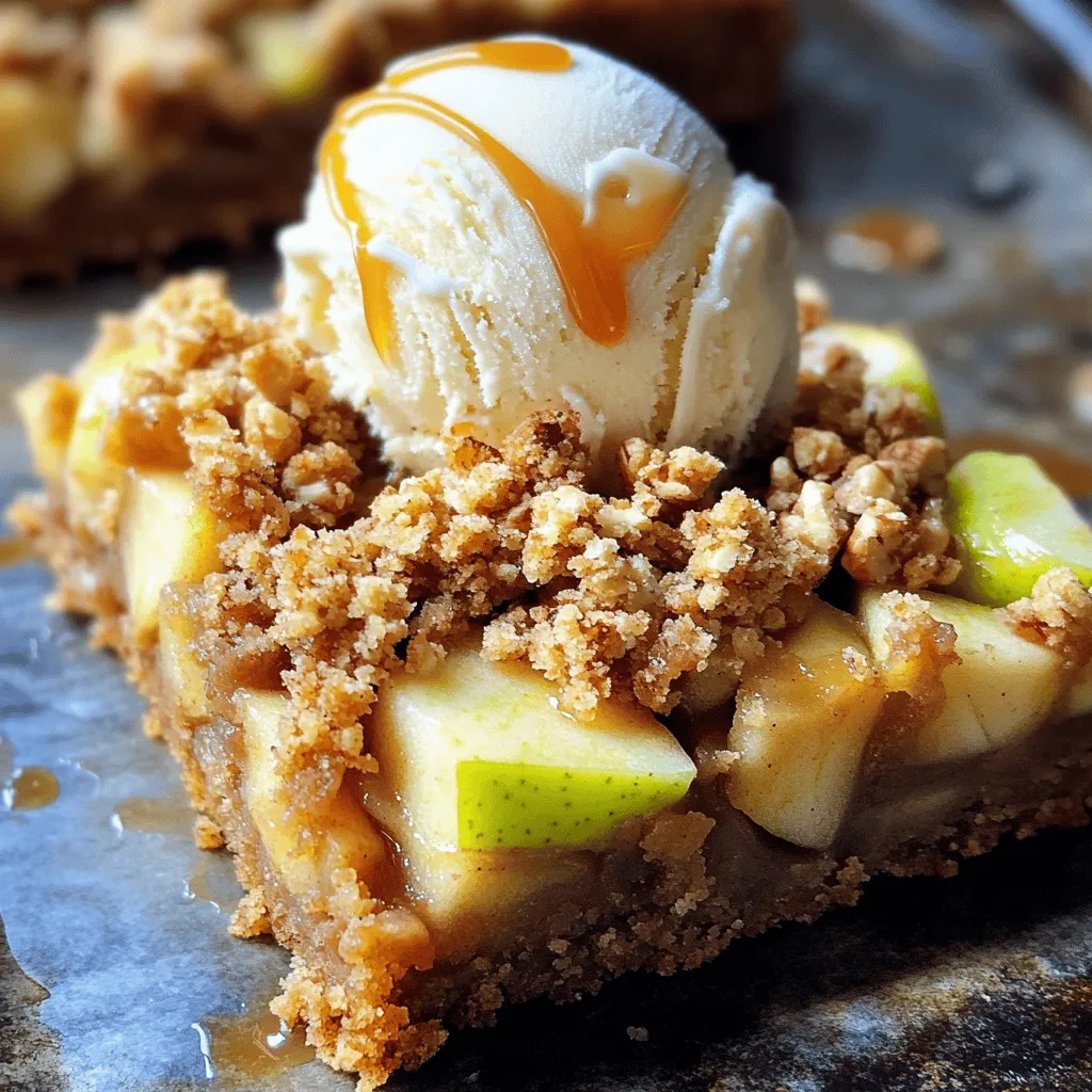 To make these blondies, you need a few key ingredients: - 1 cup unsalted butter (for browning) - 1 ½ cups brown sugar - 2 large eggs - 1 teaspoon vanilla extract - 2 cups all-purpose flour - 1 teaspoon baking powder - ½ teaspoon salt - 1 cup chopped apples (peeled and cored, such as Granny Smith) - ½ teaspoon cinnamon - ½ cup oats (for crumble) - ¼ cup chopped walnuts (optional) These ingredients come together to create a rich and tasty dessert. You can customize your blondies with some fun additions: - Use different apples, like Honeycrisp or Fuji, for varied flavors. - Swap walnuts for pecans or skip nuts altogether for nut-free blondies. - Replace regular flour with gluten-free flour for a gluten-free option. - Add chocolate chips or dried fruits for extra sweetness and texture. Think about what flavors you love! When measuring ingredients, accuracy is key. Here are a few tips: - Use a kitchen scale for precise measurements, especially for flour and sugar. - Spoon flour into your measuring cup and level it off with a knife. Avoid packing it down. - For brown sugar, press it firmly into the cup to get an accurate measure. - Always check the freshness of your baking powder and spices, like cinnamon, for the best flavor. Following these tips helps ensure your blondies turn out just right! Begin by melting 1 cup of unsalted butter in a medium saucepan over medium heat. Keep an eye on it as it melts. Stir often to prevent burning. The butter will foam up and turn golden brown. This process takes about 5-7 minutes. When it smells nutty, take it off the heat and let it cool for a few minutes. In a large bowl, combine the browned butter and 1 ½ cups of brown sugar. Beat them together until smooth. This step adds a rich flavor to your blondies. Then, add in 2 large eggs, one at a time. Mix well after each addition. Finally, stir in 1 teaspoon of vanilla extract for extra warmth. In another bowl, whisk together 2 cups of all-purpose flour, 1 teaspoon of baking powder, and ½ teaspoon of salt. This mix helps your blondies rise and stay soft. Gradually add this dry mix into the wet ingredients. Stir until just combined. Don’t over-mix; a few lumps are okay. Take 1 cup of chopped, peeled apples, like Granny Smith. Gently fold them into the blondie batter with ½ teaspoon of cinnamon. This adds a nice spice and fruity flavor to each bite. Make sure the apples are evenly mixed in. In a small bowl, mix ½ cup of oats, ¼ cup of chopped walnuts (if you like), and a pinch of salt. Add a tablespoon of flour to coat the oats. This will give your topping a nice texture. Stir it until everything is mixed well. Preheat your oven to 350°F (175°C). Grease and line a 9x9 inch square baking dish with parchment paper. Pour the blondie batter into the dish and spread it evenly. Sprinkle the crumble topping over the batter. Bake for 25-30 minutes. Check if the edges are golden brown and a toothpick comes out mostly clean with a few moist crumbs. Let them cool in the pan for 10 minutes before moving them to a wire rack. Cut into squares for serving. To make brown butter, melt unsalted butter in a saucepan over medium heat. Stir often to prevent burning. Watch closely as the butter foams. It will turn a golden brown and smell nutty. This process adds a rich flavor to your blondies. Once you see that golden color, remove it from the heat. Let it cool for a bit before using it in the recipe. To check if your blondies are done, insert a toothpick into the center. If it comes out mostly clean with a few moist crumbs, they are ready. The edges should be golden brown. If the toothpick has wet batter, bake for a few more minutes. Keep an eye on your oven timer, as baking times can vary. Serve your blondies warm for the best taste. Add a scoop of vanilla ice cream on top for a treat. Drizzle some caramel sauce over the ice cream for extra sweetness. You can also serve them with fresh apple slices on the side. This adds a nice crunch and freshness. Enjoy your delicious blondies! {{image_2}} You can switch up the apples in this recipe. Try pears, peaches, or even berries. Each fruit adds its own flavor. If you use berries, reduce the sugar a bit. They are sweeter than apples. You can also mix fruits for a fun twist. Just keep the same amount of fruit in the recipe. To make these blondies gluten-free, use a gluten-free flour blend. Many options work well, like almond or oat flour. Be sure to check the label to ensure it's safe for your needs. You might want to add a bit of xanthan gum. This helps the blondies hold together better. The taste will still be rich and delicious! For a nut-free version, skip the walnuts. You can replace them with seeds like pumpkin or sunflower. If you want a vegan option, substitute eggs with flax eggs. Mix one tablespoon of ground flaxseed with three tablespoons of water. Let it sit for a few minutes until it thickens. Also, use vegan butter instead of regular butter. This keeps the flavor rich while being plant-based. To keep your blondies fresh, store them in an airtight container. Place parchment paper between layers if stacking. This helps prevent sticking. Keep them at room temperature for up to three days. If you want to store them longer, refrigerate them for about a week. Just remember, blondies taste best when they’re fresh! You can freeze these blondies if you have leftovers. Cut them into squares and wrap each piece in plastic wrap. Then, place them in a freezer-safe bag. They will stay good for up to three months. When you are ready to eat, just thaw them in the fridge overnight. To enjoy your blondies warm, preheat your oven to 350°F (175°C). Place the blondies on a baking sheet. Warm them for about 5-10 minutes. You can also use the microwave. Heat them on low for 15-20 seconds. Just be careful not to overheat, or they will dry out. Enjoy your delicious blondies! The best apple for baking is the Granny Smith apple. It has a tart flavor that balances the sweetness of the