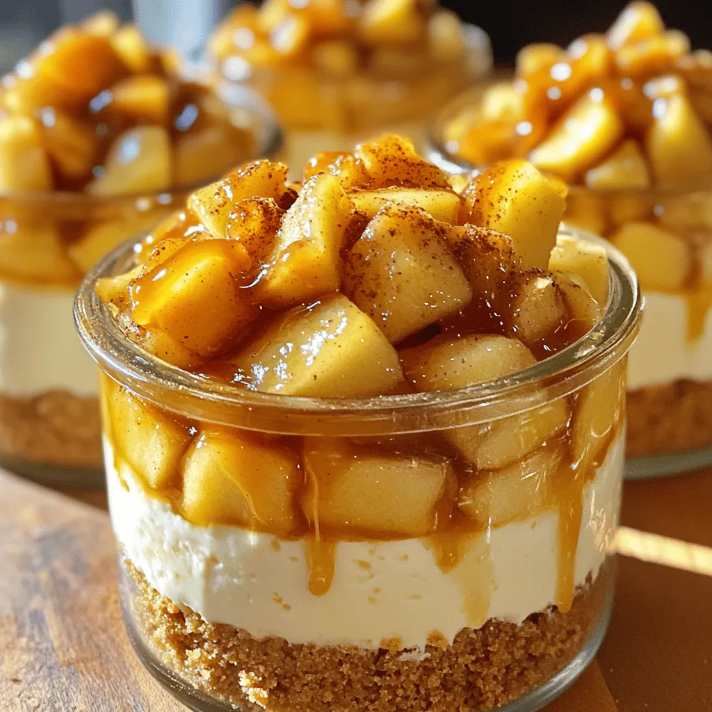 Grab small jars or dessert cups for this step. Start by adding a layer of graham cracker crumbs at the bottom of each jar. Next, add a layer of the cheesecake filling. Follow that with a layer of the caramelized apples. Repeat these layers until the jars are full. Finish with a dollop of cheesecake filling on top for a nice look.