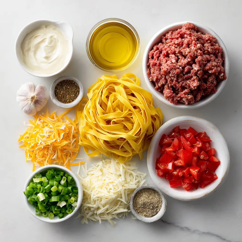 To make Cheeseburger Alfredo Pasta, gather these ingredients: