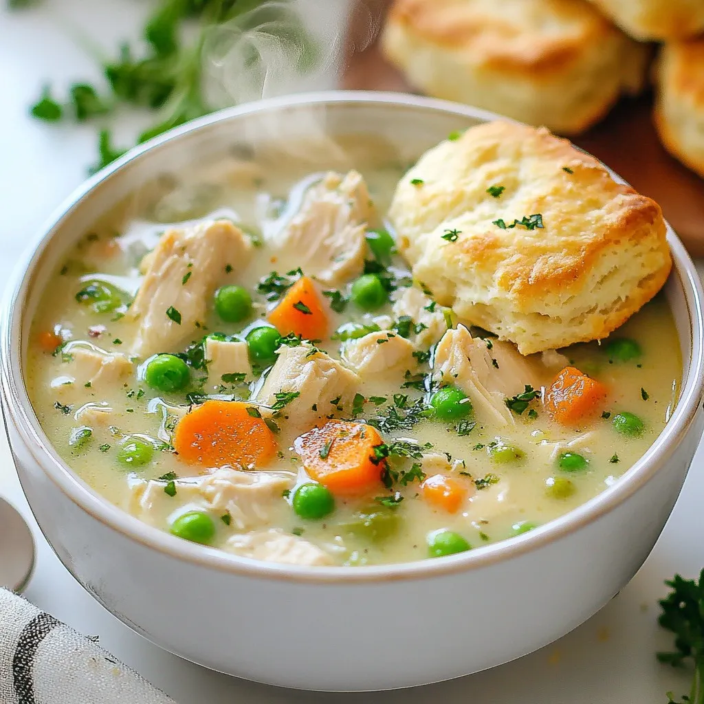 A comforting and creamy chicken pot pie soup filled with vegetables and topped with biscuits or pastry.