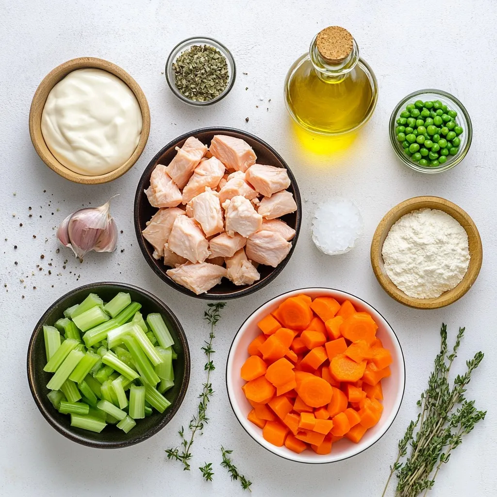 - 1 lb boneless, skinless chicken breasts, diced - 4 cups low-sodium chicken broth - 1 cup carrots, diced - 1 cup celery, diced - 1 cup frozen peas - 1 large onion, chopped - 3 cloves garlic, minced - 1/2 cup all-purpose flour - 1 cup heavy cream or coconut cream - 2 tablespoons olive oil - 1 teaspoon dried thyme - 1 teaspoon dried rosemary - Salt and pepper to taste - Fresh parsley, chopped - Biscuit dough or puff pastry (optional) I love how simple and wholesome these ingredients are. Each one plays a key role in making the soup rich and tasty. The chicken gives it protein, while the broth adds depth. Carrots and celery bring texture and flavor. Peas add a nice pop of color. Using fresh herbs like thyme and rosemary gives the soup a delightful aroma. I often choose olive oil for cooking, as it adds a nice touch. The flour is crucial for thickening the soup, making it creamy. Heavy cream or coconut cream makes it rich and velvety. If you want, you can add biscuit dough or puff pastry on top for a special finish. It’s a fun way to make it feel like a pot pie. Remember, you can mix and match these ingredients based on what you have at home. This soup is all about comfort and warmth! {{ingredient_image_1}} Sautéing the onion and garlic Start by heating two tablespoons of olive oil in a large pot over medium heat. Add one chopped onion and cook it for about five minutes. You want it to turn soft and clear. Next, stir in three minced garlic cloves. Cook this for one more minute. The smell will make your kitchen feel warm and inviting. Cooking the chicken Now, it’s time to add one pound of diced chicken breasts to the pot. Cook the chicken for five to seven minutes. Stir it often until it turns brown. Season the chicken with salt, pepper, one teaspoon of dried thyme, and one teaspoon of dried rosemary. This step adds great flavor to your soup. Adding flour and broth Once your chicken is cooked, sprinkle half a cup of all-purpose flour over the mixture. Stir it well to coat the chicken and veggies. This helps the soup thicken later. Gradually pour in four cups of low-sodium chicken broth while stirring. Make sure there are no lumps in the mix. Bring everything to a gentle simmer. Incorporating veggies and cream Now, add one cup of diced carrots and one cup of diced celery. Let it simmer for about 10 to 15 minutes until the veggies get tender. After that, stir in one cup of frozen peas and one cup of heavy cream. Cook for another five minutes. Don’t forget to taste and adjust the salt and pepper as needed. Prepping biscuit dough or puff pastry If you want a tasty topping, get your biscuit dough or puff pastry ready. Preheat your oven based on the package instructions. Cut out rounds or fun shapes from your dough. Baking instructions Place the shapes on a baking sheet and bake them until they turn golden brown. This usually takes about 10 to 15 minutes. Once done, serve your soup hot in bowls, topped with the baked biscuits or pastry. Garnish with fresh parsley for a bright touch! To make the best chicken pot pie soup, focus on cooking times for the veggies. Cook carrots and celery for about 10-15 minutes. This makes them tender but not mushy. For thickness, sprinkle flour onto the chicken and stir it in well. This helps the soup become rich and creamy. If you want a thicker soup, add more flour. If it’s too thick, add a bit more chicken broth. Herbs make this soup pop. I suggest using dried thyme and rosemary. These add warmth and depth. You can also try a splash of lemon juice. It brightens the flavor and balances the creaminess. Keep tasting as you cook. Adjust the herbs and spices to your liking. A good-looking soup makes it more fun to eat. Garnish your soup with fresh parsley. It adds color and a fresh taste. When serving, consider adding biscuit dough or puff pastry on top. This gives a crunchy, flaky finish. Serve the soup hot in bowls, and let the crust soak up some of the soup. Enjoy the hearty and comforting dish! Pro Tips Use Rotisserie Chicken: For a quicker option, you can substitute the diced chicken with pre-cooked rotisserie chicken. Just add it in during the last few minutes of cooking to heat through. Thicken with Cornstarch: If you prefer a gluten-free option, substitute the flour with cornstarch. Mix 1 tablespoon of cornstarch with a little cold water to create a slurry before adding it to the soup. Season to Taste: Always taste your soup before serving. Adjust the seasoning as needed, especially if you used low-sodium broth. A little extra salt or herbs can elevate the flavor significantly. Add Fresh Vegetables: Feel free to add other vegetables like corn or green beans for extra flavor and nutrition. Just ensure they are chopped into small pieces for even cooking. {{image_2}} You can make this soup lighter by using coconut cream instead of heavy cream. Coconut cream gives a nice, rich taste without extra fat. If you want to cut calories, try low-fat cream. Another way to make it healthier is to swap chicken for turkey or tofu. Turkey has less fat, and tofu is great for plant-based eaters. Want to change up the taste? Add curry powder to the soup for a new twist. It brings a warm, spicy flavor that’s fun and different. You can also mix in cheese for a creamy finish. Cheese adds a rich, satisfying layer to your soup. Try sharp cheddar or creamy gouda for great results. If you need a gluten-free option, use cornstarch to thicken the soup. Just mix it with a little cold water before adding it to the pot. This keeps the soup smooth and thick without flour. For the topping, you can skip biscuits or pastry. Instead, use gluten-free bread or crackers to enjoy with your soup. To keep your Chicken Pot Pie Soup fresh, use airtight containers. Glass or plastic containers work well. Make sure the soup cools to room temperature before sealing. Refrigerating is best if you plan to eat it within a few days. For longer storage, freeze the soup. It keeps well in freezer-safe bags