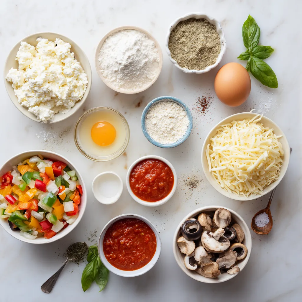 To make a tasty Cottage Cheese Pizza Bake, you need some basic and easy-to-find items. Cottage cheese adds creaminess and protein. Mozzarella cheese gives that gooey, melty texture everyone loves. The egg helps bind everything together. Flour adds structure to the bake. Baking powder makes it rise a bit.