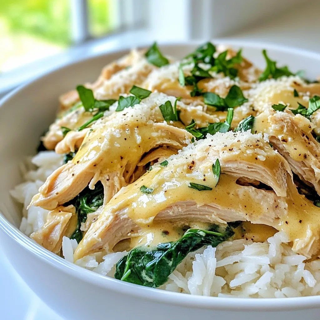 - 4 boneless, skinless chicken breasts - 1 cup chicken broth - 1 cup heavy cream - 1 cup freshly grated Parmesan cheese - 6 cloves garlic, minced - 1 teaspoon Italian seasoning - 1 teaspoon garlic powder - 1 teaspoon onion powder - Salt and pepper to taste - 2 cups baby spinach - Chopped fresh parsley for garnish When you make Creamy Garlic Parmesan Crockpot Chicken, the right ingredients matter. Start with four boneless, skinless chicken breasts. They are easy to cook and shred. For the sauce, use one cup of chicken broth and one cup of heavy cream. This gives your dish a rich flavor. Don't forget the freshly grated Parmesan cheese! It adds a nice cheesy touch. Next, we need seasonings. Six cloves of minced garlic bring a strong, tasty punch. Add one teaspoon of Italian seasoning, garlic powder, and onion powder. Each spice enhances the dish's flavor. Make sure to include salt and pepper to taste, as they balance everything out. Finally, we have some fresh touches. Two cups of baby spinach add color and nutrients. For a nice finish, chop some fresh parsley to sprinkle on top. Together, these ingredients create a dish that is creamy, flavorful, and inviting. {{ingredient_image_1}} First, take your four boneless, skinless chicken breasts. Place them at the bottom of your crockpot. Season them with salt, pepper, garlic powder, and onion powder. This step adds flavor right to the meat. Make sure you coat each breast well. The seasoning helps to enhance the dish's taste. Now, grab a mixing bowl. Combine one cup of chicken broth, one cup of heavy cream, and one cup of freshly grated Parmesan cheese. Add six minced garlic cloves and one teaspoon of Italian seasoning. Mix well until smooth. If you want a creamy texture, use a whisk. This will help blend the ingredients nicely. Pour the creamy mixture over the chicken in the crockpot. Ensure the chicken is fully covered. Cover the crockpot with a lid and set it to cook. If you choose low heat, cook for 6-7 hours. For high heat, cook for 3-4 hours. You’ll know it’s done when the chicken is tender. In the last 30 minutes, stir in two cups of baby spinach. Cover it again to let the spinach wilt. This step adds color and nutrition to your dish. Once cooked, shred the chicken using two forks right in the crockpot. Stir everything until well combined. This will create a creamy, delicious meal. To get that creamy texture, mix the heavy cream and cheese well. Make sure there are no lumps in your cheese. Use a whisk for the best results. When it comes to shredding chicken, use two forks. Hold the chicken with one fork and pull with the other. This method gives you nice, tender shreds. You can choose to cook on low or high. Cooking on low takes 6-7 hours. High setting cooks the chicken in 3-4 hours. Check the chicken around the end of cooking. It should be tender and easy to shred. If it’s still tough, give it more time. For extra flavor, add herbs like thyme or rosemary. You can also try adding a pinch of red pepper flakes for some heat. If you want to switch up the cheese, consider using Asiago or Romano. These cheeses add unique tastes that can elevate your dish. Pro Tips Use Fresh Ingredients: Always opt for fresh garlic and high-quality Parmesan cheese for the best flavor in your dish. Adjust the Creaminess: If you prefer a lighter dish, you can substitute half of the heavy cream with Greek yogurt or sour cream. Perfectly Cooked Chicken: To prevent overcooking, use a meat thermometer to ensure the chicken reaches an internal temperature of 165°F. Versatile Base: This creamy mixture works great with other proteins like shrimp or tofu, so feel free to experiment! {{image_2}} If you need a gluten-free option, you can easily adapt this recipe. Use gluten-free chicken broth. Many brands offer safe choices. Check labels for hidden gluten in other ingredients. Heavy cream and Parmesan cheese are typically gluten-free, so no worries there. Adding veggies can boost nutrition and flavor. Consider using carrots, bell peppers, or zucchini. These veggies add color and taste. If you want to add hard vegetables like carrots, put them in early. This way, they cook well. For soft veggies like spinach or zucchini, add them in the last hour. This keeps them tender and fresh. You can swap chicken for turkey if you prefer. Ground turkey works well too. If you want a meatless dish, consider using chickpeas or tofu. Both options soak up the creamy sauce, making them tasty. This way, everyone can enjoy this creamy garlic delight! To store leftovers safely, let the dish cool first. Place the creamy garlic Parmesan chicken in an airtight container. It can stay fresh for up to 3-4 days in the fridge. Use glass containers for easy reheating and to avoid stains from the sauce. To freeze the dish for later use, let it cool completely. Portion it into freezer-safe bags or containers. Label each bag with the date. You can freeze it for up to 2-3 months. For thawing, move it from the freezer to the fridge for 24 hours before reheating. For reheating in the microwave, use a microwave-safe dish. Cover it with a lid or a damp paper towel to trap moisture. Heat in 1-minute intervals until warm. On the stovetop, heat gently on low, stirring often. To avoid dryness, add a splash of chicken broth or cream while reheating. Yes, you can use frozen chicken. Just remember, cooking time may change. If you use frozen chicken, cook on high for about 4-5 hours. Fresh chicken cooks faster and stays juicy. Always check that the chicken reaches 165°F for safety. You can make this dish ahead of time. It’s great for meal prep! Cook it the night before. Store it in the fridge. Then, reheat it when you are ready to eat. This chicken stays creamy and tasty even after reheating. Pair this chicken with tasty sides. Here are some ideas: - Cooked rice - Pasta - Garlic bread - Steamed vegetables - A fresh salad These sides balance the rich flavors of the chicken. Enjoy your meal! This blog post cover
