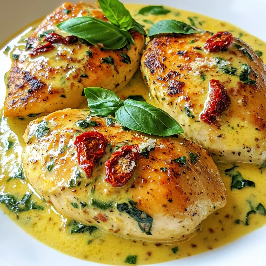 Now, return the cooked chicken breasts to the skillet. Spoon the creamy sauce over them. Let everything cook together for an additional 3-5 minutes. This helps the flavors blend. Taste the sauce and adjust the seasoning with more salt and pepper if needed. If you like, sprinkle some grated Parmesan cheese for extra richness. Finally, garnish the dish with fresh basil leaves before serving. Enjoy this creamy garlic Tuscan chicken with rice or garlic toast for a complete meal.