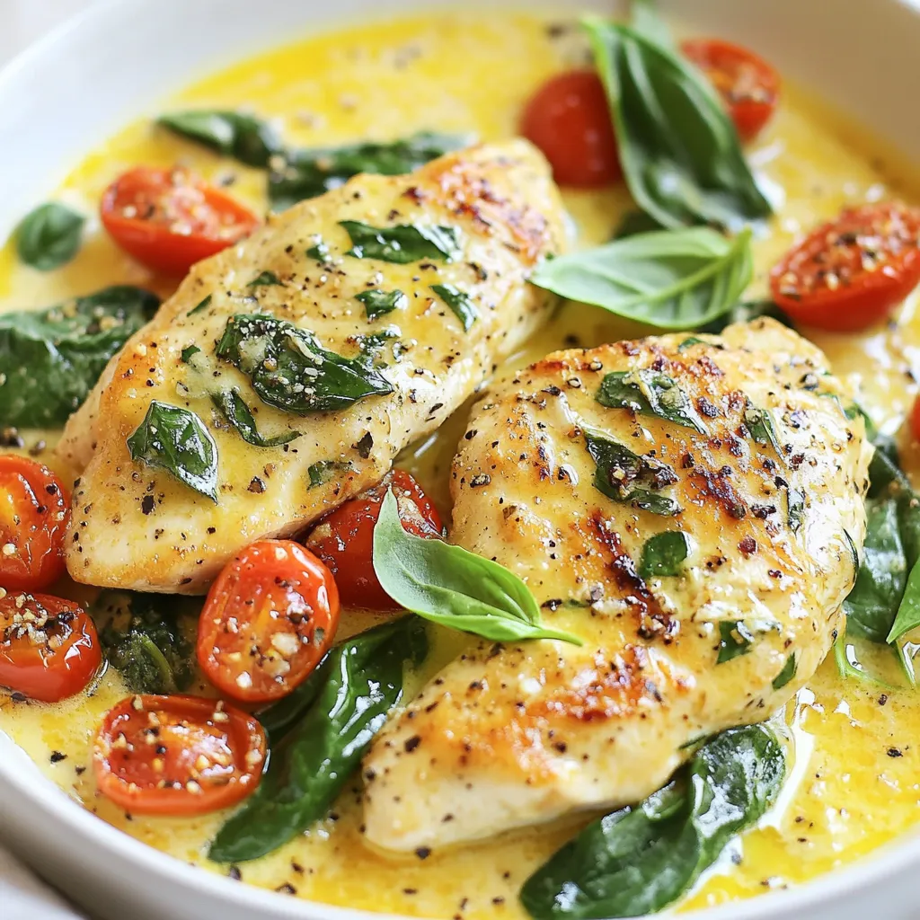 For this tasty meal, you need a few main items. Gather these: - 4 boneless, skinless chicken breasts - 2 tablespoons olive oil - 1 cup heavy cream - ½ cup grated Parmesan cheese These ingredients form the base of your creamy garlic sauce. The chicken gives you protein, while the cream and cheese create that rich, smooth texture. Next, let’s add flavor with some seasonings. You will need: - 4 cloves garlic, minced - 1 teaspoon Italian seasoning - Salt and pepper to taste The garlic adds a nice punch. Italian seasoning gives it a warm, herby taste. Always adjust salt and pepper to match your preference. Finally, fresh produce brightens the dish. Include: - 1 cup cherry tomatoes, halved - 1 cup spinach leaves - Fresh basil leaves for garnish Cherry tomatoes add color and sweetness, while spinach offers a fresh, green touch. Garnish with basil for a lovely finish. {{ingredient_image_1}} First, season your chicken breasts. Use salt, pepper, and Italian seasoning. Rub these spices on both sides of the chicken. This step adds great flavor. Next, heat olive oil in a large skillet. Set the heat to medium-high. Once the oil is hot, add the chicken breasts. Sear them for about 5 to 7 minutes on each side. You want them golden brown and fully cooked. After cooking, remove the chicken from the skillet and set it aside. Now, lower the heat in the skillet. Add the minced garlic to the pan. Sauté the garlic for about 1 minute. It should smell amazing but be careful not to burn it. Then, pour in the heavy cream. Stir it well with the garlic. Allow the mixture to simmer gently. After a few minutes, add the halved cherry tomatoes and fresh spinach. Cook for about 3 to 4 minutes. The tomatoes should soften, and the spinach will wilt. Next, stir in the grated Parmesan cheese. This will make your sauce creamy and rich. Taste it and add salt or pepper if needed. Return the chicken to the skillet now. Coat each piece in the creamy sauce. Let it simmer for an extra 2 to 3 minutes. This warms the chicken back up. Finally, serve the chicken on plates. Spoon the creamy sauce generously over each breast. For a nice touch, garnish with fresh basil leaves. You can also serve it with garlic bread or pasta. Enjoy your delicious meal! To get juicy chicken, start with boneless, skinless breasts. Season each piece with salt, pepper, and Italian seasoning. This adds flavor. Heat olive oil in your skillet until hot. Sear the chicken for 5-7 minutes on each side. Look for a golden brown color. This means the chicken is cooked well. Always check the center for doneness. It should be 165°F. Let the chicken rest after cooking. This keeps it moist and tender. To make a creamy sauce, use heavy cream. Start by sautéing minced garlic in your skillet. Do this for about a minute. Be careful not to burn it. Then, add the heavy cream and stir. Let it simmer gently. This helps the flavors combine. After that, add cherry tomatoes and spinach. Cook until the tomatoes soften and the spinach wilts. Finally, mix in grated Parmesan cheese. This adds richness and thickness to the sauce. Adjust with salt and pepper to taste. For a beautiful plate, serve the chicken with the creamy sauce on top. Garnish with fresh basil leaves. This adds a nice pop of color. You can pair the dish with garlic bread. It’s perfect for soaking up the sauce. Another option is to serve it over pasta. The creamy sauce clings to the noodles well. You can also add a side salad for freshness. Enjoy this savory dinner delight! Pro Tips Perfectly Sear the Chicken: Ensure your skillet is hot enough before adding the chicken to achieve a golden brown crust. This not only enhances flavor but also locks in juices. Use Fresh Ingredients: For the best flavor, opt for fresh garlic, spinach, and tomatoes. Fresh ingredients will elevate the dish and bring out vibrant flavors. Adjust Creaminess: If you prefer a thinner sauce, add a splash of chicken broth or pasta water to reach your desired consistency without losing flavor. Garnish for Presentation: Always garnish with fresh basil or parsley just before serving. This adds a pop of color and a fresh aroma that enhances the overall appeal of the dish. {{image_2}} You can switch out chicken for other proteins. Try shrimp or salmon for a change. Both cook well with the creamy sauce. If you want a meatless version, use tofu or chickpeas. These options still soak up the tasty flavors. If you have dietary needs, you can make easy swaps. Use coconut cream instead of heavy cream for a dairy-free option. For a low-carb meal, skip the pasta and serve the chicken with zucchini noodles. You can also use nutritional yeast instead of Parmesan cheese for a vegan twist. Serve the creamy garlic Tuscan chicken in fun ways. You can place it over fluffy rice or creamy polenta. For a crunchy touch, serve it in a taco shell. Pair it with a fresh salad for a light meal. Or, simply enjoy it with crusty garlic bread for dipping. To store your creamy garlic Tuscan chicken, let it cool. Then place it in an airtight container. This helps keep it fresh. You can keep it in the fridge for up to three days. Make sure to label your container with the date. This way, you won’t forget when you made it! When you're ready to eat your leftovers, you can reheat them easily. Place the chicken in a skillet over low heat. Add a splash of chicken broth or cream to keep it moist. Heat for about 5-7 minutes until warm. Stir occasionally to heat it evenly. You can also use a microwave. Just cover the dish and heat in short bursts. Check it often to avoid overheating. If you want to save some for later, freezing is a great option. Place the cooled chicken in a freezer-safe container. Use freezer bags for more space-saving. Remove as much air as possible to avoid freezer burn. You can freeze it for up to three months. When you’re ready to eat, thaw it in the fridge overnight. Then reheat it as mentioned above for a tasty meal again! Yes, you can make Creamy Garlic Tusc
