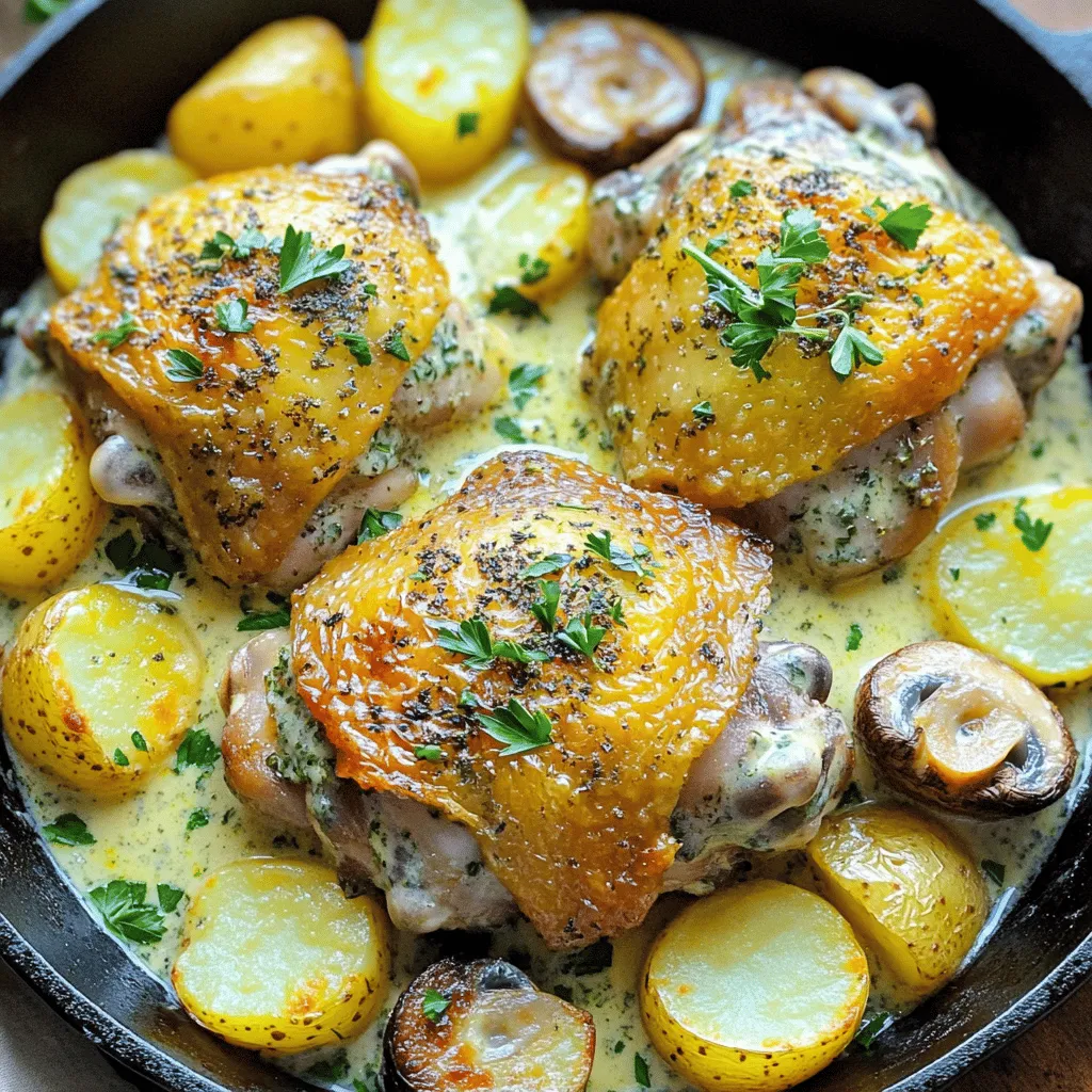 - 4 bone-in, skin-on chicken thighs - 4 medium-sized potatoes, cut into quarters - 8 ounces of cremini mushrooms, halved - 1 cup heavy cream - 4 cloves garlic, minced - 1 tablespoon fresh rosemary, chopped - 1 tablespoon fresh thyme, chopped - 2 tablespoons olive oil - Salt and pepper to taste - Fresh parsley for garnish This dish brings together simple yet flavorful ingredients. The chicken thighs are rich and juicy. They give a great taste to the meal. The potatoes add heartiness, while the mushrooms bring an earthy note. I love using fresh herbs like rosemary and thyme. They really boost the flavor. Garlic adds a warm, savory touch that makes the sauce sing. Heavy cream ties everything together. It creates a smooth and rich sauce. When baked, it coats the chicken and veggies, making each bite creamy and delicious. Don't forget the olive oil! It helps brown the chicken and veggies while adding flavor. Salt and pepper are key too; they enhance every taste in the dish. Fresh parsley makes a lovely garnish. It adds color and a hint of freshness to the plate. This dish is not just about taste, but also about presentation. You can find all these ingredients at your local store. Grab them, and you are ready to start cooking! - Preheat your oven to 400°F (200°C). - Prepare potatoes and mushrooms in a large bowl. Start by preheating your oven. This step is key to getting the chicken and veggies nice and crispy. While the oven heats, grab a large bowl. Cut your potatoes into quarters and add them to the bowl. Next, take your cremini mushrooms and halve them. Toss these in with the potatoes. Drizzle 1 tablespoon of olive oil over the potatoes and mushrooms. Add salt and pepper to taste. Toss everything until it is well-coated. This helps the flavors blend and ensures even cooking. - Create the creamy herb sauce and pour over chicken and vegetables. In the same bowl, we will make the creamy herb sauce. First, add 1 cup of heavy cream. Then, throw in 4 cloves of minced garlic, 1 tablespoon of chopped rosemary, and 1 tablespoon of chopped thyme. Mix everything well. The sauce should be creamy and aromatic. Now, take a large cast-iron skillet or a roasting pan. Arrange your seasoned potatoes and mushrooms in an even layer. Place the chicken thighs on top of the vegetables. Finally, pour the creamy herb sauce over everything. Make sure the chicken and veggies are well covered. - Bake and monitor the dish halfway through cooking for even roasting. Now it’s time to bake! Slide your skillet into the preheated oven. You will need to bake it for 45-50 minutes. The chicken should reach an internal temperature of 165°F (75°C) when done. Halfway through cooking, gently stir the potatoes and mushrooms. This will help them roast evenly and soak up more sauce. Enjoy the delicious smells filling your kitchen as it cooks! To get crispy chicken skin, start with dry chicken thighs. Pat them dry with paper towels. This step helps the skin become crispy when roasting. Next, use a hot oven set at 400°F (200°C). Cook the chicken for 45-50 minutes to achieve that beautiful golden-brown hue. To test for doneness, use a meat thermometer. Insert it into the thickest part of the thigh. The chicken is safe to eat when it reaches 165°F (75°C). You can also cut into the thigh. The juices should run clear, not pink. For a twist on the creamy herb sauce, add a splash of lemon juice. This brightens the flavor and adds a nice tang. You can also mix in some grated Parmesan cheese. It gives the sauce a rich depth. If you like heat, add a pinch of red pepper flakes for a subtle kick. When serving, I love to keep it rustic. You can serve directly from the skillet. It looks inviting and warm. If you want a more elegant touch, transfer everything to a large serving platter. Don’t forget to sprinkle fresh parsley on top. This adds color and freshness to the dish. {{image_2}} You can easily switch up your main ingredients. Here are some simple swaps: - Chicken: Use chicken breasts or drumsticks instead of thighs. - Mushrooms: Try shiitake or button mushrooms for a different taste. These swaps can change the texture and flavor. Chicken breasts will be leaner, while drumsticks offer juicy meat. Different mushrooms can add unique notes to your dish. Want to add a twist? Here are some flavor ideas: - Herbs: Mix in other herbs, like oregano or sage, for a fresh taste. - Wine: Add a splash of white wine to the sauce. This gives a nice depth. Herbs can brighten the dish and make it more fragrant. A bit of white wine can enhance the creaminess and add a rich flavor. Experiment with these ideas to find your favorite! After enjoying your creamy herb roasted chicken, store any leftovers in an airtight container. This keeps the chicken, mushrooms, and potatoes fresh. Place the container in the refrigerator within two hours of cooking. The dish will stay good for up to three days. Make sure to label the container with the date. This helps you track freshness easily. To reheat your chicken, preheat your oven to 350°F (175°C). Place the chicken and veggies in a baking dish. Cover it with foil to keep moisture in. Heat for about 20-25 minutes, or until warm. Check the temperature to ensure it's at least 165°F (75°C). This method keeps the chicken juicy and the skin crispy. If you want to save some for later, you can freeze the dish. Let the chicken cool completely before freezing. Place it in a freezer-safe container. This way, it can last for about three months. When ready to eat, thaw it overnight in the fridge. Reheat as mentioned above for the best taste. How long does it take to cook chicken thighs? It takes about 45 to 50 minutes to cook chicken thighs at 400°F. Check the internal temperature. It should reach 165°F for safety. The skin will turn golden brown as it cooks. Can I make this dish in advance? Yes, you can prepare this dish ahead of time. Cook the chicken and veggies, then store them in the fridge. Reheat in the oven at 