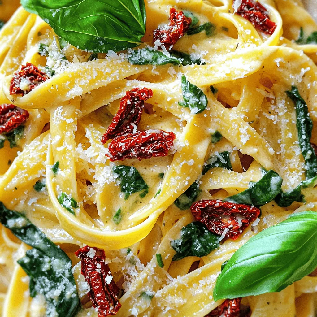 When I make Creamy Tuscan Sun-Dried Tomato Pasta, I start with the pasta. Fettuccine works great, but any pasta you love will work, too. Cook it just until al dente for a nice bite. Next, I heat olive oil in a skillet. I add minced garlic and let it sizzle. The smell is amazing! Then I stir in sun-dried tomatoes. They give a rich, tangy flavor that makes this dish special.