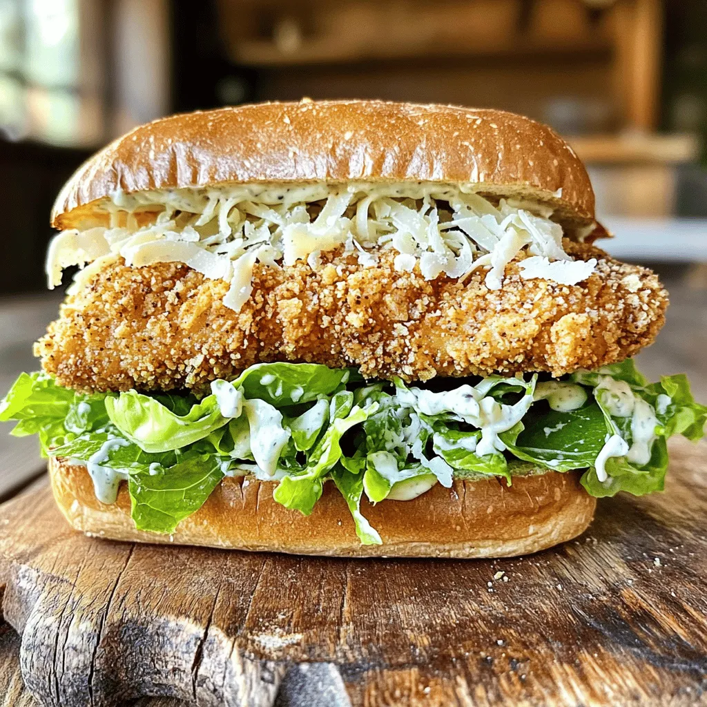 Serve the Crispy Chicken Caesar Sandwich warm for the best taste. A side of sweet potato fries pairs well. You can also add a light salad for a fresh touch. For a fun twist, cut the sandwich in half and use toothpicks to hold it together. This makes it easy to share. Presentation matters, so serve it on a rustic wooden board for a casual vibe. Don’t forget to sprinkle extra Parmesan on top for a finishing touch!