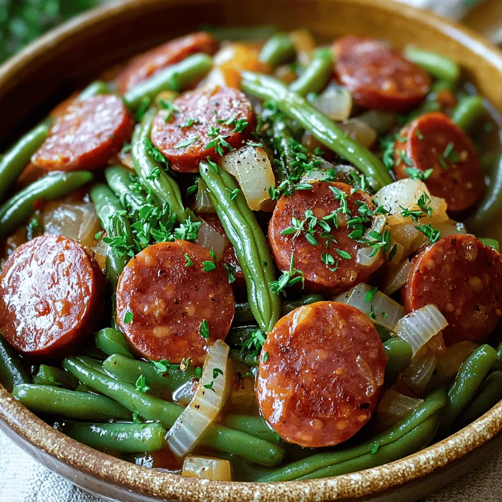 The main ingredients in this dish bring great taste and nutrition. Kielbasa offers a savory flavor, while fresh green beans add crunch. The onion and garlic give a nice aroma and depth to the meal.