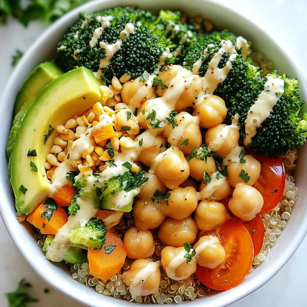 Now, it’s time to assemble your power bowls. Start with the cooked quinoa as the base. Divide the quinoa into four bowls. Next, add equal amounts of cooked chickpeas, steamed broccoli, diced avocado, shredded carrot, and halved cherry tomatoes to each bowl. Drizzle the tahini dressing over the top of each bowl. Finally, sprinkle ¼ cup of pumpkin seeds and garnish with fresh chopped parsley. This final touch adds color and crunch. Enjoy your nutritious meal!