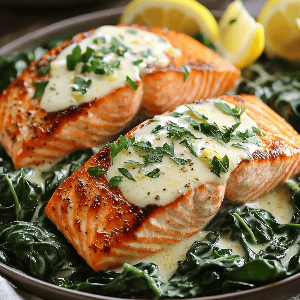 To finish, gently place the salmon back into the skillet. Spoon the creamy sauce over each fillet. Let it simmer for one more minute to heat through. When serving, plate the salmon and drizzle the creamy spinach sauce over the top. Garnish with chopped parsley and add lemon wedges on the side for a fresh touch. Enjoy your Easy Creamy Salmon Florentine!