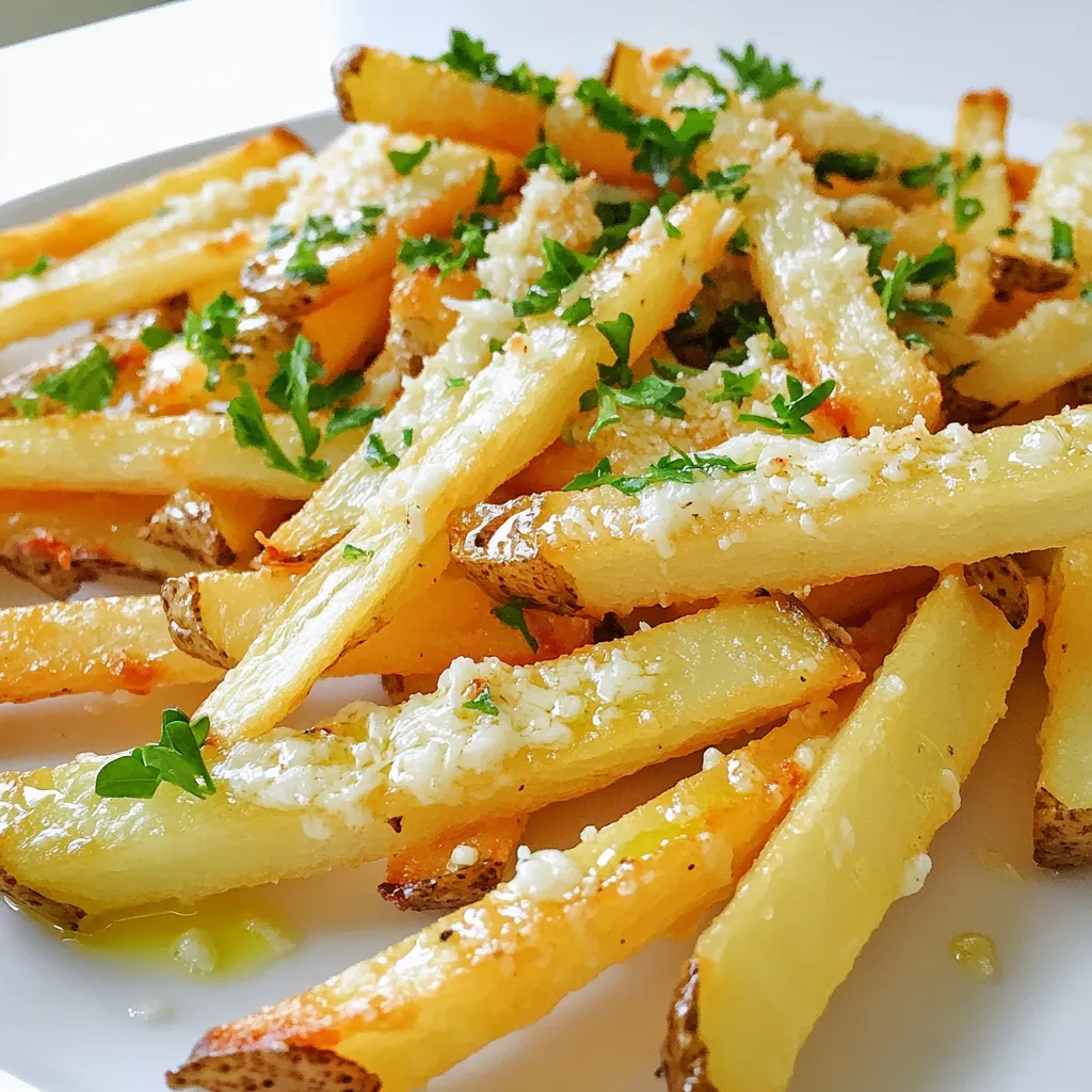 - 4 large russet potatoes - 4 cloves of garlic, minced - 1/2 cup grated Parmesan cheese - 1/4 cup olive oil - 1 teaspoon dried oregano - 1 teaspoon garlic powder - Salt and pepper to taste - Fresh parsley, chopped (for garnish) Gathering the right ingredients is key for Garlic Parmesan French Fries. Russet potatoes work best. They are starchy and create a crispy fry. Use fresh garlic for a strong flavor. The Parmesan cheese adds a rich, savory touch. Olive oil helps the fries crisp up nicely in the oven. You’ll also want some dried oregano and garlic powder. These spices boost the flavor. Don't forget salt and pepper! They help balance all the tastes. Lastly, fresh parsley makes a lovely garnish. It adds color and freshness to your dish. Make sure you have everything ready. This will make cooking easier and more fun! - Wash and peel the potatoes. - Cut potatoes into thin strips or wedges. Start by scrubbing the russet potatoes under cold water. This removes dirt and grit. After washing, use a peeler to remove the skin. The skin adds texture but is optional. Next, slice the potatoes. Aim for uniform thin strips for even cooking. You can also cut them into wedges if you prefer a thicker fry. - Soaking to remove excess starch. - Draining and drying the potatoes. Once cut, soak the potato strips in cold water for about 30 minutes. This step is key! Soaking helps remove starch, which makes fries crispier. After soaking, drain the water. Use a clean kitchen towel to dry the potato strips well. Moisture can make them soggy while baking. - Prepare the oil and seasoning mixture. - Coating the potato strips. In a large bowl, mix the olive oil, minced garlic, oregano, garlic powder, salt, and pepper. Stir until well combined. Next, add the dried potato strips to the bowl. Toss them gently until each strip is fully coated. This mixture will give the fries a strong flavor. - Spreading on a baking sheet. - Baking and flipping instructions. Preheat your oven to 425°F (220°C). Spread the seasoned potato strips in a single layer on a baking sheet lined with parchment paper. Make sure they are not overlapping. Bake for about 25-30 minutes. Flip the fries halfway through to ensure even browning. You want them golden and crispy. - Adding Parmesan cheese. - Garnishing with fresh parsley. As soon as the fries come out of the oven, sprinkle the grated Parmesan cheese on top. The heat from the fries will melt the cheese a bit, making it stick. Finally, add fresh parsley for a pop of color and flavor. Serve them hot and enjoy! Soaking the potatoes is key. It removes extra starch. This helps the fries get crispier. Soak them in cold water for 30 minutes. After soaking, dry the potatoes well. Use a clean kitchen towel to remove moisture. Make sure to spread the fries in a single layer on the baking sheet. This helps them cook evenly. Flip them halfway through baking for a nice golden color. Russet potatoes are the best choice for frying. They are starchy and get crispy outside. Their fluffy inside makes a great contrast. Other potatoes may not give you the same result. Stick with russets for the best flavor and texture. You can spice up your fries easily. Try adding more herbs like thyme or rosemary. A sprinkle of chili powder adds a nice kick. Adjust the salt levels to your taste. Always taste the seasoning mix before coating the fries. This way, you can ensure they are just right. {{image_2}} You can switch up the cheese in this recipe. Instead of Parmesan, try Pecorino Romano. Its saltiness adds a nice kick. You can also use a blend of cheeses. Mixing mozzarella gives a gooey texture with a mild taste. A hint of cheddar can add depth. These options create unique flavors in every bite. Want a kick? Add chili powder or crushed red pepper to the oil mix. This will spice up your fries and make them exciting. For a tasty dip, whip up garlic aioli. Mix mayo, minced garlic, lemon juice, and a pinch of salt. This creamy dip pairs perfectly with your spicy fries. You can make these fries vegan. Instead of Parmesan, use nutritional yeast. It has a cheesy flavor and is packed with nutrients. For the oil, try coconut or avocado oil. Both give the fries a crispy edge while keeping them plant-based. Enjoy these delicious fries that fit your diet! To keep your Garlic Parmesan French Fries fresh, follow these tips: - Allow the fries to cool completely. - Place them in an airtight container. - Use a container that fits them well. This keeps them from getting crushed. - You can also wrap them in foil for short-term storage. When it’s time to enjoy your leftovers, make sure they stay crispy. Here’s how: - Preheat your oven to 375°F (190°C). - Spread the fries in a single layer on a baking sheet. - Bake for about 10-15 minutes. Keep an eye on them. - To avoid sogginess, skip the microwave. It can make fries soft. - For extra crispiness, you can use a toaster oven. These steps will help you savor those tasty fries even after their first serving! Yes, you can make Garlic Parmesan French Fries in an air fryer. Just follow the same steps for cutting and soaking the potatoes. Toss them in the oil mixture. Then, place them in the air fryer basket in a single layer. Cook at 400°F (200°C) for about 15-20 minutes, shaking the basket halfway through. This method makes the fries crispy and delicious. To make the fries extra crispy, follow these tips: - Soak the cut potatoes in cold water for 30 minutes. - Dry them well with a towel after soaking. - Use a high oven temperature, like 425°F (220°C). - Flip the fries halfway through baking for even crispiness. - Make sure they are in a single layer on the baking sheet. Garlic Parmesan French Fries pair well with many dishes. Here are some great options: - Burgers or sandwiches - Grilled chicken or steak - Dipping sauces like ranch or ketchup - A fresh salad for balance These fries can be a fun side dish or a tasty snack. Yes, there are some healthier options: - Use sweet potatoes i