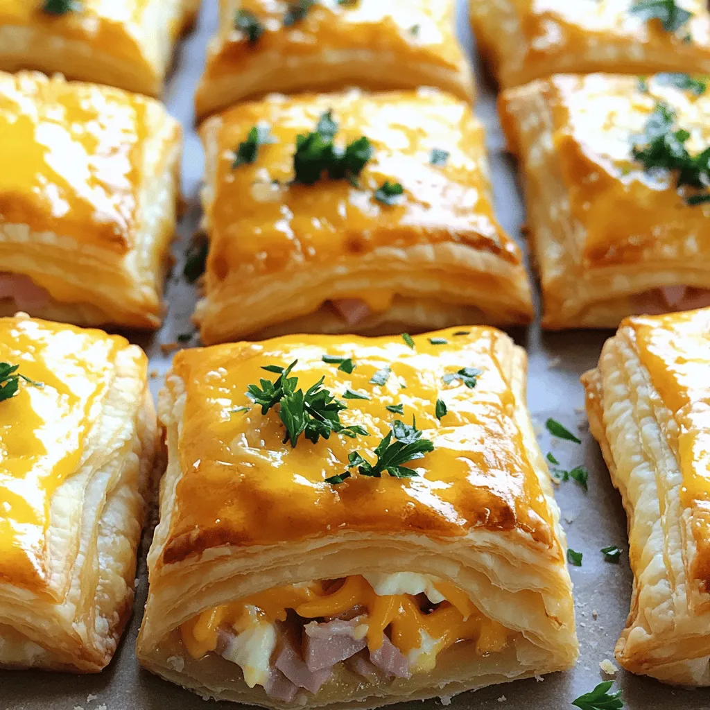 To make Ham & Cheese Puff Pastry Squares, you need some key ingredients. Puff pastry is a must. It gives the squares their flaky texture. Cooked ham adds savory flavor. Cheddar cheese brings that gooey, melty goodness. Cream cheese makes the filling rich and creamy.