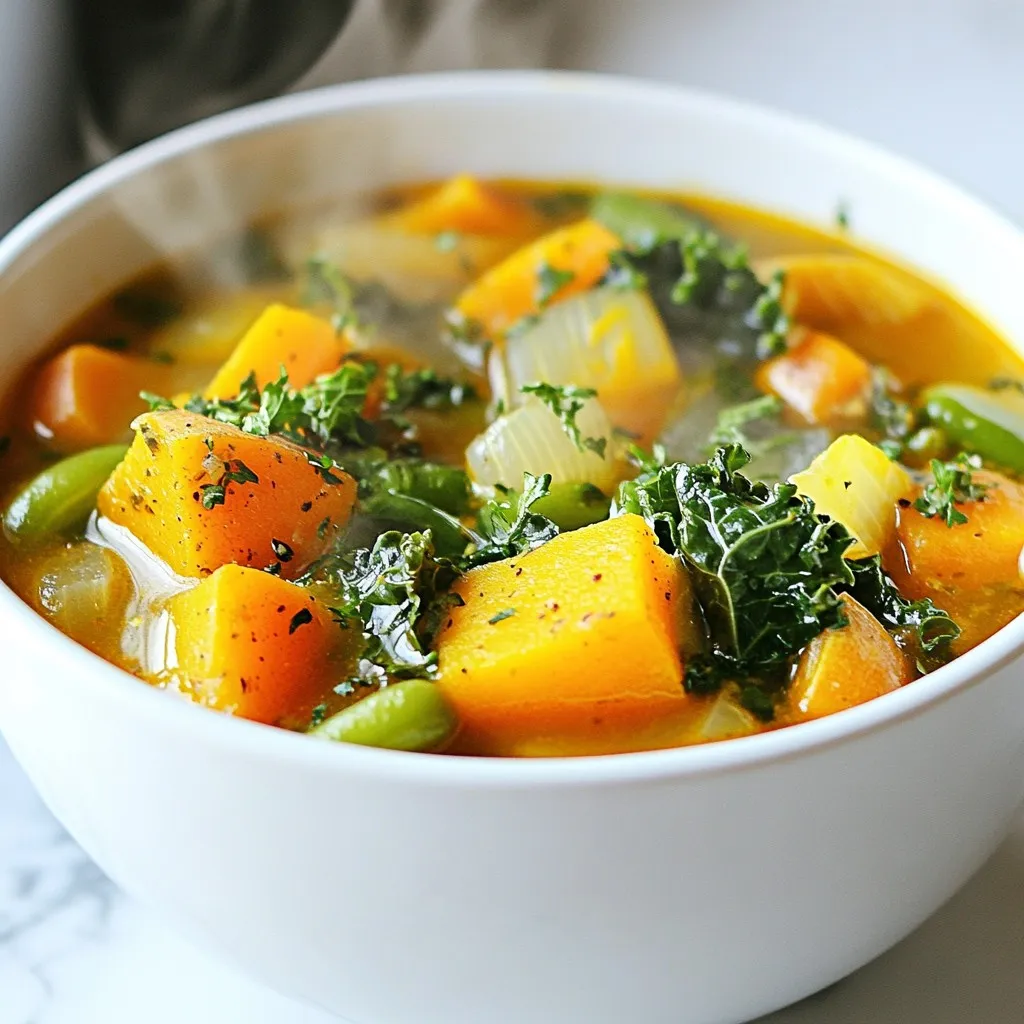 To make Cozy Harvest Veggie Soup, you need: - 1 tablespoon olive oil - 1 medium onion, chopped - 2 cloves garlic, minced - 3 carrots, diced - 2 stalks celery, diced - 1 small butternut squash, peeled and cubed - 1 medium sweet potato, peeled and diced - 1 cup green beans, trimmed and cut into 1-inch pieces - 1 can (14 oz) diced tomatoes, with juices - 4 cups vegetable broth - 1 teaspoon dried thyme - 1 teaspoon ground cumin - 1 teaspoon paprika - Salt and pepper to taste - 2 cups kale, chopped - Fresh parsley for garnish Each of these ingredients adds a unique taste and texture. The onion and garlic create a great base. The squash and sweet potato add sweetness and creaminess. Fall brings many seasonal veggies. You can find fresh carrots, squash, and kale in your local market. Using fresh, seasonal ingredients boosts the flavor and nutrition of your soup. Seasonal produce often tastes better and is more nutritious. Plus, it supports local farmers. Want to make your soup even healthier? Consider adding: - 1 cup cooked lentils - 1 cup chickpeas - 1 cup quinoa These options add protein and fiber. You can also toss in some spinach or extra herbs for added freshness. Mixing in these add-ins can make your soup a meal on its own. They are easy to find and add great taste. {{ingredient_image_1}} Start by heating the olive oil in a large pot over medium heat. Add the chopped onion and cook for about five minutes. You want it to turn soft and clear. Next, add the minced garlic and stir for one more minute. This step fills your kitchen with a lovely aroma. Now, it’s time to add the diced carrots, celery, butternut squash, and sweet potato. Cook these for about five to seven minutes. Stir often until they begin to soften. Then, toss in the green beans and the can of diced tomatoes, including their juices. This mix brings a lot of color and flavor to your soup. Pour in the vegetable broth and stir in dried thyme, ground cumin, and paprika. Don’t forget to add salt and pepper to taste. Bring your soup to a boil. Once it bubbles, lower the heat, cover, and let it simmer for 20 to 25 minutes. This step allows the vegetables to become tender. During the last five minutes, add the chopped kale. It should wilt and turn bright green. Taste your soup and adjust the seasonings if needed. Serve it hot, finished with fresh parsley on top. Enjoy every comforting spoonful! To get the best flavor, use fresh veggies. They add depth and brightness. Start with sautéing onion and garlic in olive oil. This builds a tasty base. Use good-quality vegetable broth for rich flavor. Don't rush the simmering time. Allow the veggies to soften and blend well. Add spices like thyme, cumin, and paprika. They bring warmth and aroma to your soup. One common mistake is not chopping veggies evenly. This can lead to uneven cooking. Avoid adding too much salt too early. Taste your soup before adding more. Remember, you can always add more later. Another mistake is not letting the soup simmer long enough. This step is key for melding the flavors. Lastly, don’t skip the kale! It adds nutrition and color. To make this soup well, you need a sturdy pot. A Dutch oven or large stockpot works great. Use a sharp knife for chopping veggies. A cutting board is also essential. A wooden spoon helps stir the soup. You might want a ladle for serving. A measuring cup will help with broth and spices. These tools will make your cooking easier and more fun. Pro Tips Prep Your Veggies in Advance: Chop and prep your vegetables a day ahead to save time on cooking day. Customize Your Greens: Feel free to substitute kale with spinach or Swiss chard based on availability or preference. Enhance Flavor with Fresh Herbs: Adding fresh herbs like thyme or parsley right before serving can elevate the soup's flavor. Storage Tips: This soup stores well in the fridge for up to 5 days and can be frozen for up to 3 months. Just reheat before serving! {{image_2}} You can change the flavor of your soup by using different herbs and spices. Instead of thyme, try rosemary or oregano. They add a nice twist. If you like heat, add a pinch of cayenne pepper. For a hint of sweetness, use a dash of cinnamon. Experiment with what you have at home. This way, you can make the soup your own. If you want a filling soup, add protein. You can include cooked chicken or turkey for a comforting meal. Beans are a great choice, too. Chickpeas or black beans work well. Just add one can when you add the tomatoes. This boosts the nutrition and makes your soup heartier. You can also stir in lentils for extra fiber. To keep the soup vegan, use vegetable broth like the recipe shows. For a gluten-free version, check the broth label. Most vegetable broths are gluten-free, but some might not be. You can add quinoa instead of any grains. This makes it gluten-free and adds protein. If you use more veggies, like zucchini or bell peppers, you keep it fresh and tasty. To keep your Cozy Harvest Veggie Soup fresh, store it in an airtight container. Let it cool to room temperature before sealing it. This helps avoid condensation, which can make the soup watery. Place the container in the fridge if you plan to eat it soon. It will stay good for about 3 to 4 days. Freezing is a great way to save your soup for later. Use freezer-safe containers or bags. Leave some space at the top, as the soup will expand when frozen. Label each container with the date. You can freeze the soup for up to 3 months. When you're ready to eat, just thaw it in the fridge overnight. When it’s time to enjoy your soup again, reheat it on the stove for the best taste. Pour the soup into a pot and heat over medium heat. Stir often and add a splash of water or broth if it seems too thick. You can also use the microwave, but keep an eye on it. Heat in short bursts and stir between each burst to ensure even heating. Yes, you can use fresh herbs! Fresh herbs add bright flavor. Use three times more fresh herbs than dried. For this soup, 