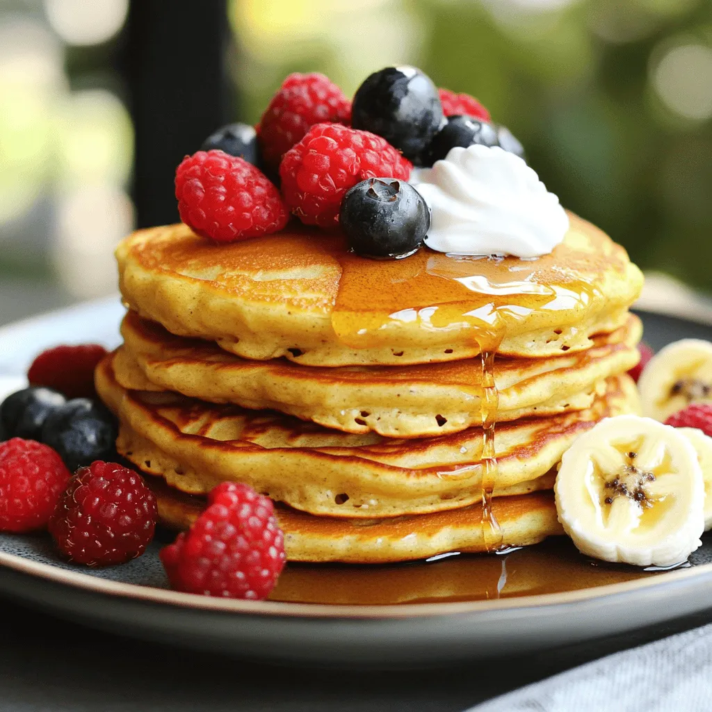 - 1 cup cottage cheese - 2 large eggs - 1/2 cup rolled oats Cottage cheese gives these pancakes a great protein boost. It makes them fluffy and soft. Eggs help bind everything together while adding more protein. Rolled oats add texture and fiber, making these pancakes filling. - 1 tablespoon honey or maple syrup - Fresh fruits for serving - Greek yogurt or nut butter for topping You can add honey or maple syrup for sweetness. Fresh fruits like berries or banana slices make a colorful topping. Greek yogurt or nut butter boosts protein even more and adds creaminess. - 1/2 teaspoon baking powder - 1/4 teaspoon salt - 1 teaspoon vanilla extract - Cooking spray or a small amount of oil Baking powder helps the pancakes rise. Salt enhances the flavors. Vanilla extract adds a warm, sweet aroma. Use cooking spray or oil to prevent sticking on the skillet. Start by putting all the ingredients in a blender. You need: - 1 cup cottage cheese - 2 large eggs - 1/2 cup rolled oats - 1/2 teaspoon baking powder - 1/4 teaspoon salt - 1 teaspoon vanilla extract - 1 tablespoon honey or maple syrup (optional) Blend until smooth. The batter should be thick but pourable. If it's too thick, add a splash of milk or water. Heat a non-stick skillet over medium heat. Lightly grease it with cooking spray or a bit of oil. Pour about 1/4 cup of batter onto the skillet for each pancake. Cook for 3-4 minutes. Look for bubbles on the surface. When the edges look set, it’s time to flip. Carefully flip the pancakes and cook for 2-3 more minutes. They should be golden brown. Remove from the skillet and keep warm. Repeat with the rest of the batter. Serve these pancakes warm. Top them with fresh fruits like berries or banana slices. You can also add a dollop of Greek yogurt or a drizzle of nut butter for extra protein. For a nice look, stack the pancakes and sprinkle some fruits on top. Enjoy a colorful and tasty breakfast! To get the right pancake texture, start with the batter. If it’s too thick, add a splash of milk or water. You want it to flow easily but not be runny. Use a blender to mix everything well. This makes a smooth batter that helps your pancakes rise. When cooking, timing is key. Heat your skillet on medium. Pour about 1/4 cup of batter for each pancake. Cook for 3-4 minutes until you see bubbles. Once the edges look set, it’s time to flip! Cook an extra 2-3 minutes until golden brown. You can prepare the batter ahead of time. Mix all the ingredients and store them in the fridge. This way, you can save time in the morning. Just give it a quick stir before cooking. If you have leftover pancakes, you can easily reheat them. Use a microwave for about 30 seconds. Or, heat them in a skillet on low heat. This keeps them warm and tasty. One big mistake is overmixing the batter. This can make your pancakes tough. Mix just until combined to keep them fluffy. Another mistake is cooking at the wrong temperature. If the skillet is too hot, the outside burns. If it’s too cool, the pancakes won’t cook through. Aim for medium heat for the best results. {{image_2}} You can make these pancakes even better by adding spices. Try mixing in cinnamon or nutmeg for warmth. Both spices bring a cozy flavor that pairs well with the pancakes. If you want a different twist, use flavored cottage cheese. Options like chive or herb can make savory pancakes that surprise your taste buds. For those who need gluten-free options, you can swap rolled oats for gluten-free oats. This keeps the pancakes soft and tasty. If you're vegan, replace the eggs with flaxseed meal mixed with water. This gives your pancakes the same great texture without using eggs. Want to jazz up your pancakes? Add fruits or nuts right into the batter. Chopped bananas or blueberries work great and add natural sweetness. You can also try savory versions by mixing in cheese or cooked spinach. These changes can turn your pancakes into a full meal that really satisfies. Store your leftover pancakes in an airtight container. This keeps them fresh and prevents drying out. They stay good in the fridge for about 3 to 4 days. Make sure to let them cool completely before sealing them up. To freeze pancakes, stack them with parchment paper between each one. This helps them not stick together. Place the stack in a freezer bag or container. They can last up to 2 months in the freezer. When you want to eat them, thaw them in the fridge overnight. You can reheat them in the toaster or microwave until warm. Batch cooking these pancakes makes for easy breakfasts. You can make a big batch on a weekend. Then, store them in the fridge or freezer. For toppings, keep them separate. This way, you can choose what you want each time. Fresh fruits, yogurt, or nut butter are all great options! To make pancakes fluffier, you need to add air to the batter. Here are some tips: - Separate the egg whites from the yolks. Beat the whites until they are stiff, then fold them gently into the batter. This adds lightness. - Use baking powder. It helps create bubbles that make pancakes rise. - Don’t overmix the batter. Mixing too much can make pancakes dense. Stir just until combined. Yes, you can use non-dairy cottage cheese. Look for brands that offer a similar texture. Here are some suggestions: - Tofu-based cottage cheese gives a creamy feel. - Almond or soy-based options work well too. Just check for added sugars. - Make sure the flavor is neutral. This helps keep your pancakes tasty. These pancakes are high in protein. Here’s the nutritional breakdown per serving: - 1 cup of cottage cheese provides about 25 grams of protein. - Two large eggs add another 12 grams. - Each serving gives you around 18-20 grams of protein. This is great for breakfast! You can tell your pancakes are done by looking for these signs: - Bubbles will form on the surface. This shows they are cooking well. - The edges will look set and dry. - When flipped, they should be golden brown. If they are too dark, lower the heat