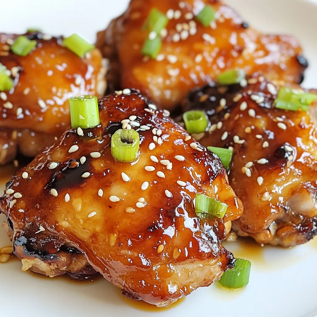 - Transfer the chicken thighs to a serving platter. Drizzle any remaining glaze over the top and garnish with chopped green onions and sesame seeds.