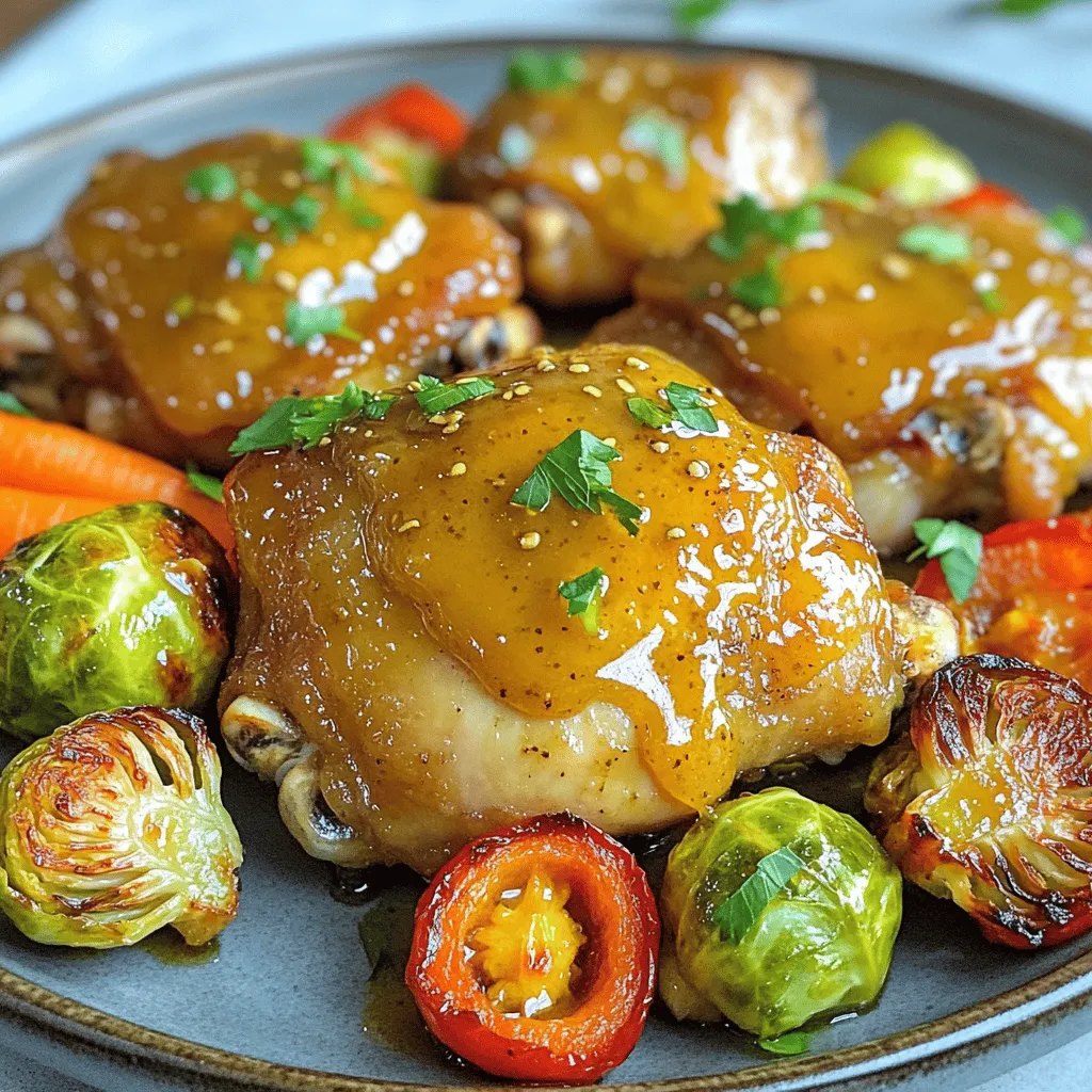 - 4 chicken thighs (bone-in, skin-on) - 2 tablespoons honey - 2 tablespoons Dijon mustard - 1 tablespoon olive oil - 1 teaspoon garlic powder - 1 teaspoon smoked paprika - Salt and pepper to taste The chicken thighs bring great flavor and juiciness. Bone-in and skin-on pieces cook evenly. They also stay moist while baking. The honey adds a sweet touch. Dijon mustard gives it that tangy kick. Olive oil helps blend the flavors and keeps the chicken tender. Garlic powder and smoked paprika add depth. Salt and pepper enhance all the tastes. - 1 cup baby carrots - 1 cup Brussels sprouts, halved - 1 cup red bell pepper, sliced Baby carrots give a nice crunch and natural sweetness. Brussels sprouts bring a nutty flavor when roasted. Red bell peppers add color and sweetness. These veggies complement the chicken well. They soak up the honey mustard sauce as they cook. - Fresh parsley - Additional seasonings Fresh parsley brightens up the dish. It adds a pop of color and freshness. You can also add more spices if you like. Feel free to mix in herbs like thyme or rosemary. These can add more flavor and make it special. To start, grab a small bowl. In it, whisk together 2 tablespoons of honey, 2 tablespoons of Dijon mustard, and 1 tablespoon of olive oil. Add 1 teaspoon of garlic powder, 1 teaspoon of smoked paprika, and some salt and pepper. Mix it well until all the ingredients blend smoothly. This marinade adds flavor and moisture to the chicken. Marinating time is key. I suggest letting the chicken sit for at least 15 minutes. If you have more time, let it marinate for up to 2 hours in the fridge. This will deepen the flavors and make your dish even tastier. Now, let’s focus on the veggies. Take a large sheet pan and spread out 1 cup of baby carrots, 1 cup of halved Brussels sprouts, and 1 cup of sliced red bell pepper. Drizzle them with a little olive oil. This helps them cook well and adds flavor. Sprinkle some salt and pepper for seasoning. Use your hands to toss the vegetables. Make sure they are coated evenly with oil and spices. This step is important for good flavor and texture. Preheat your oven to 400°F (200°C). This is the perfect temperature for roasting. Once the oven is hot, place the marinated chicken thighs on top of the veggies, skin side up. Pour the remaining honey mustard mixture over everything. Bake the pan for 30 to 35 minutes. Check the chicken to ensure it's cooked through. The internal temperature should reach 165°F (75°C). You can use a meat thermometer for this. If you want extra crispy skin, broil for 2 to 3 minutes at the end. Just watch it closely to avoid burning. After baking, let the dish rest for 5 minutes before serving. This helps all the flavors settle. Don’t forget to garnish with fresh parsley for a nice touch! To get crispy chicken skin, use the broiler. After baking the chicken and veggies, switch your oven to broil. Broil for 2-3 minutes, but watch it closely. The skin will turn golden brown. This extra step adds great texture without much effort. Want to boost the flavor? Try adding fresh herbs like rosemary or thyme. You can also sprinkle in some red pepper flakes for heat. These spices blend well with honey mustard. Experiment with your favorite herbs to make it your own. Timing is key for your veggies. Start by baking the chicken and add the veggies halfway through. This way, they cook just right. The carrots and Brussels sprouts will be tender, but not mushy. Keep an eye on them for the best results. {{image_2}} You can easily swap chicken thighs for other meats. Pork, for example, works well. Use pork chops or tenderloin for a juicy dish. Turkey thighs are another great choice. They absorb flavors just like chicken. For a lighter option, consider fish. Salmon or white fish cooks quickly and pairs nicely with honey mustard. Seasonal veggies can change your dish's taste. In spring, use asparagus or peas. They add freshness and color. Summer brings zucchini and tomatoes, which are juicy and sweet. Fall is perfect for squash and root vegetables. Try sweet potatoes or beets for a hearty addition. Winter offers hearty greens like kale or collards, which hold up well in the oven. You can adjust the honey mustard sauce to your taste. For a milder flavor, use less mustard. If you like it sweet, add more honey. Want some heat? Mix in a pinch of cayenne or red pepper flakes. For a tangy twist, add a splash of apple cider vinegar or lemon juice. Each change gives a new flavor to your dish. After you enjoy your Honey Mustard Sheet Pan Chicken Veggies, store any leftovers right away. Place the chicken and veggies in an airtight container. This keeps them fresh and safe to eat. Refrigerate within two hours of cooking. Leftovers will last for about three to four days in the fridge. Label the container with the date, so you know when to use it. When it’s time to enjoy your leftovers, reheating is key. You want to keep the chicken moist and the veggies tasty. The best way is to use an oven. Preheat it to 350°F (175°C). Place the chicken and veggies on a baking sheet. Heat for about 15 to 20 minutes. Check if the chicken is warm in the center. You can also use a microwave. Heat in short bursts. Stir the veggies to make sure they heat evenly. If you want to save some for later, freezing works great! First, let the dish cool completely. Then, place it in a freezer-safe container or bag. Be sure to remove as much air as possible. This helps prevent freezer burn. You can freeze the dish for up to three months. When you're ready to eat, thaw it in the fridge overnight. Reheat it as mentioned above for the best taste. Yes, you can use boneless chicken. Boneless chicken is quicker to cook. It also absorbs the honey mustard flavor well. However, bone-in chicken has more flavor and stays juicier. If you choose boneless, reduce cooking time by about 10-15 minutes. Always check that the chicken reaches 165°F (75°C) to ensure it is safe to eat. Honey mustard chicke