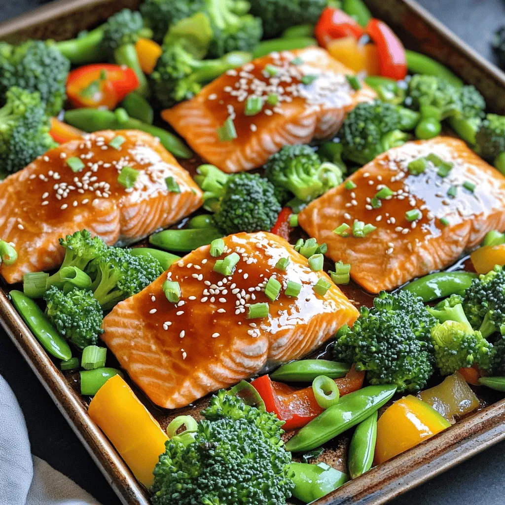 - 4 salmon fillets - 1/4 cup honey - 1/4 cup low sodium soy sauce - 2 tablespoons rice vinegar - 2 teaspoons sesame oil - 3 cloves garlic, minced - 2 cups broccoli florets - 1 bell pepper, sliced - 1 cup snap peas - 1 tablespoon olive oil To make the Honey Soy Salmon Sheet Pan Dinner, start with these simple and fresh ingredients. The salmon fillets are the star of this dish. Their rich flavor pairs perfectly with the sweet honey and salty soy sauce. The marinade adds depth. It uses rice vinegar for a tangy kick. The sesame oil brings a nutty note, while minced garlic enhances the overall taste. For the vegetables, you have colorful options. Broccoli florets are a great source of nutrients. Bell peppers add crunch and sweetness. Snap peas offer a nice snap and bright green color to the dish. Using these ingredients creates a balanced meal. You will enjoy the sweet, savory, and fresh flavors. Plus, it all cooks on one sheet pan for easy cleanup. - Preheat your oven to 400°F (200°C) and line a large sheet pan with parchment paper. This makes cleanup easy. - In a small bowl, mix together 1/4 cup honey, 1/4 cup low sodium soy sauce, 2 tablespoons rice vinegar, and 2 teaspoons sesame oil. Add 3 minced garlic cloves and 1 inch of grated ginger. Whisk until combined. This mixture is your marinade. - Place 4 salmon fillets on one side of the sheet pan. - Pour half of the marinade over the salmon. Make sure each fillet gets coated. Let the salmon marinate for at least 15 minutes, so it absorbs those great flavors. - In another bowl, toss 2 cups of broccoli florets, 1 sliced bell pepper, and 1 cup of snap peas with 1 tablespoon of olive oil, salt, and pepper. Make sure the veggies are well coated. - Arrange the vegetable mix on the other side of the sheet pan with the salmon. Drizzle the remaining marinade over the veggies for extra flavor. - Bake the salmon and vegetables in the preheated oven for about 15-20 minutes. Check for doneness. The salmon should flake easily with a fork, and the veggies should be tender-crisp. - Once done, remove the pan from the oven and let it cool for a couple of minutes before serving. - Adjust cooking time based on salmon thickness. Thicker fillets need more time. Aim for 15-20 minutes at 400°F (200°C). - Use parchment paper for easy cleanup. It keeps the pan clean and saves time. - Add citrus or fresh herbs for extra flavor. Lemon or lime juice brightens the dish. Try basil or cilantro for a fresh twist. - For perfectly flaky salmon, check for doneness. When the fish flakes easily with a fork, it's ready. Don't overcook to keep it tender. - Garnish with sesame seeds and chopped green onions. It adds color and crunch to your dish. - For a rustic look, serve directly from the sheet pan. You can also plate the salmon and veggies nicely. A lemon wedge on the side gives a fresh touch. {{image_2}} You can switch out proteins in this recipe. Try chicken or tofu instead of salmon. Both options work well with the honey soy flavor. For veggies, mix it up! Use carrots, zucchini, or asparagus. Feel free to get creative with your favorite vegetables. Want a twist on the marinade? Use maple syrup or agave instead of honey. These sweeteners give a nice taste. You can also try different sauces. Teriyaki or hoisin sauce can add a fun kick. Just remember to balance the flavors to keep it tasty. If you need gluten-free options, look for gluten-free soy sauce. This keeps the dish safe for those with gluten issues. To make it lighter, reduce the amount of honey or use less oil. You can also add more veggies for a low-calorie meal. These small changes keep the flavor but lower the calories. To keep your Honey Soy Salmon fresh, refrigerate leftovers right away. Place the salmon and veggies in an airtight container. This keeps them safe from germs and helps them stay tasty. You can store the leftovers for up to three days in the fridge. If you want to freeze the salmon, wrap each piece in plastic wrap. Then, put the wrapped salmon in a freezer bag. This way, it stays fresh for up to three months. To thaw, move it to the fridge overnight before you reheat. To reheat your salmon without drying it out, use the oven. Set the oven to 300°F (150°C). Place the salmon on a baking sheet and cover it with foil. Bake for about 10-15 minutes. This keeps it moist and flaky. For the vegetables, you can use a skillet. Heat a little olive oil over medium heat. Add the veggies and stir for a few minutes until warm. This method helps keep them crisp and tasty. How long to cook salmon on a sheet pan? I usually cook salmon for about 15 to 20 minutes. The time depends on your oven and the thickness of the fillets. The salmon is done when it flakes easily with a fork. Can I use frozen salmon for this recipe? Yes, you can use frozen salmon. Just make sure to thaw it first. This helps the marinade soak in better and ensures even cooking. Can I make this dish ahead of time? You can prep the salmon and veggies ahead. Marinate the salmon and chop the veggies. Store them separately in the fridge. When ready to cook, just arrange everything on the sheet pan and bake. What can I serve with honey soy salmon? This dish pairs well with rice or quinoa. You can also serve a fresh salad or some crusty bread on the side. These options add different textures and flavors to your meal. What are the health benefits of salmon? Salmon is rich in omega-3 fatty acids. These fats are great for heart health. It also provides protein, vitamins, and minerals. Eating salmon can boost your mood and brain function too. How many calories does this dish have per serving? Each serving of honey soy salmon has about 350 calories. This includes the salmon and vegetables. It’s a healthy option that keeps you full without too many calories. This blog post guides you through making a simple and tasty honey soy salmon dish. You learned about the key ingredients, marinade tips, and how to prepare and bake everything. I shared tricks for enha