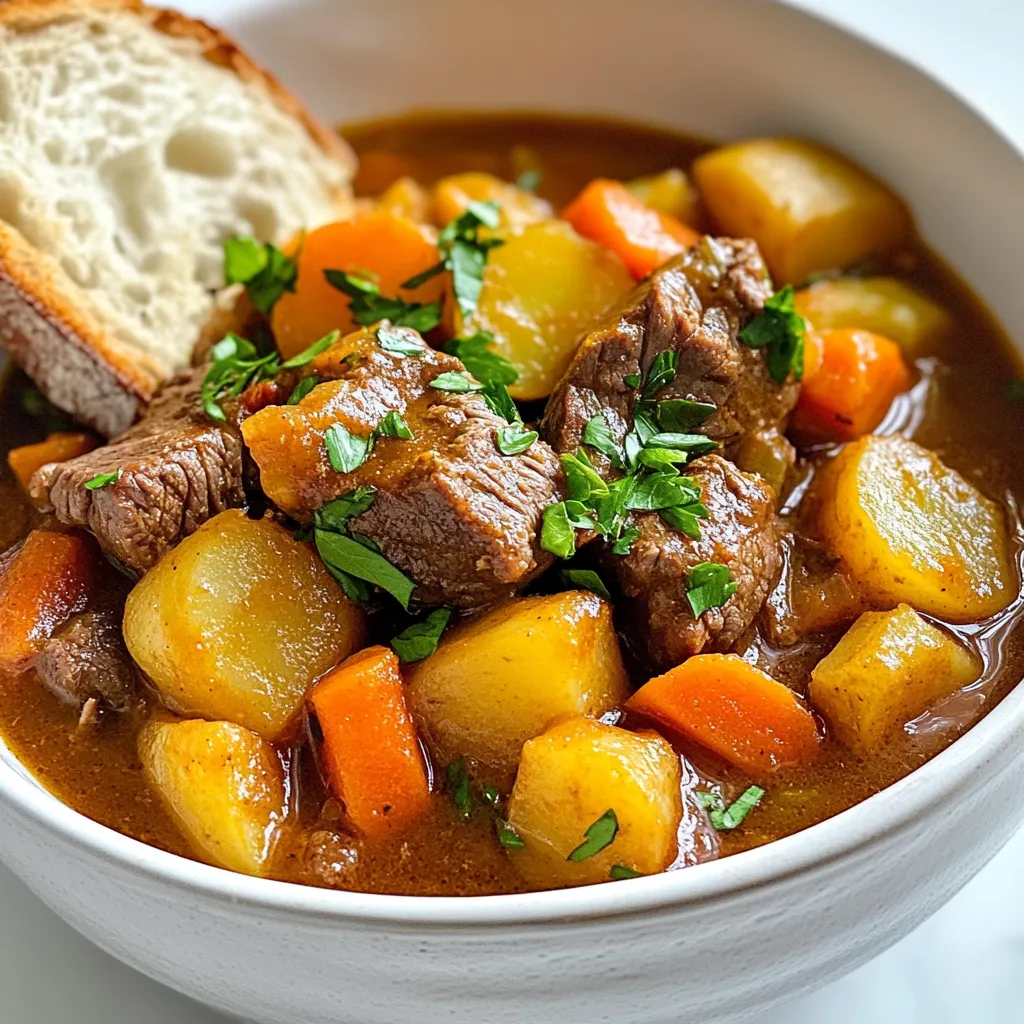 Serve your beef stew in deep bowls. This makes it look inviting. For a pop of color, sprinkle fresh parsley on top. Pair the stew with crusty bread. It’s perfect for soaking up the delicious broth.