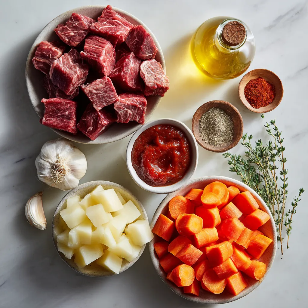 Each ingredient plays a key role in making the beef stew rich and tasty. The beef chuck gives the stew its hearty base. Beef broth adds depth. Carrots and potatoes bring sweetness and texture. The onion and garlic provide a fragrant foundation.