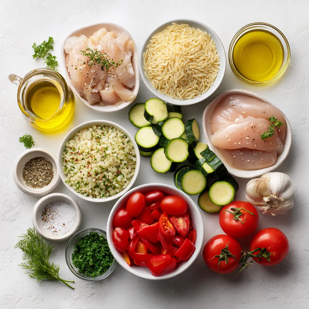 First, gather all your ingredients. You will need chicken, orzo, veggies, and spices. This will make cooking smooth and fast. Chop your onion, zucchini, and red bell pepper. Mince the garlic. Halve the cherry tomatoes. Dice the chicken into small pieces.