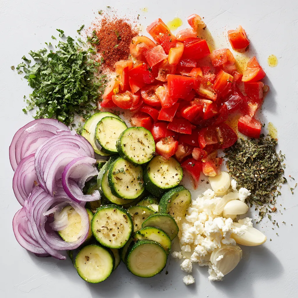 These ingredients work together to bring vibrant flavors to your dish. Each item adds not just taste but also nutrition. The chicken gives a great protein boost, while the veggies add fiber and vitamins. The feta cheese introduces a creamy tang, and herbs like oregano and thyme enhance the overall aroma.