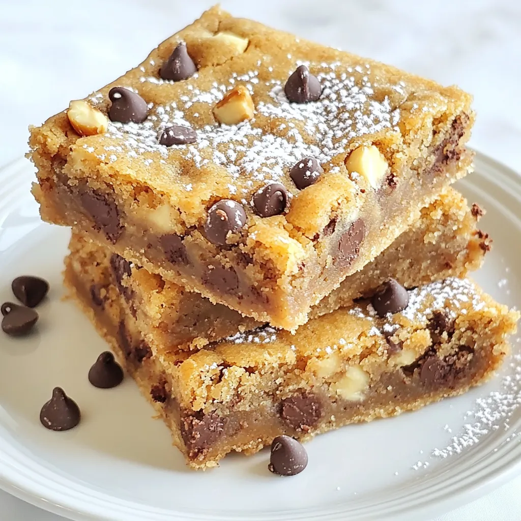To make Melt-In-Your-Mouth Chocolate Chip Cookie Bars, you need a few simple ingredients. Here’s what you will need: - 1 cup unsalted butter, softened - 1 cup brown sugar, packed - 1/2 cup granulated sugar - 2 large eggs - 2 teaspoons vanilla extract - 3 cups all-purpose flour - 1 teaspoon baking soda - 1/2 teaspoon salt - 2 cups semi-sweet chocolate chips - 1/2 cup chopped walnuts (optional) Each ingredient plays an important part in the flavor and texture of these cookie bars. The softened butter gives a rich taste. Brown sugar adds moisture and a slight chew. Granulated sugar helps with sweetness and structure. The eggs bind everything together. Vanilla extract brings warmth and depth. All-purpose flour gives the bars their body, while baking soda helps them rise. Salt balances the sweetness, making every bite better. Chocolate chips are the star of the show, melting into gooey pockets of joy. If you like, you can add walnuts for crunch and flavor. Use fresh, high-quality ingredients for the best results. {{ingredient_image_1}} First, preheat your oven to 350°F (175°C). This step warms the oven so the cookie bars bake evenly. Next, prepare a 9x13-inch baking pan. You can grease it lightly or line it with parchment paper. Lining it makes it easy to lift out the bars later. In a large bowl, start creaming together 1 cup of softened unsalted butter, 1 cup of brown sugar, and 1/2 cup of granulated sugar. Mix until it looks light and fluffy. This step adds air, making your bars soft. Now, add in 2 large eggs, one at a time, mixing well after each. Then, add 2 teaspoons of vanilla extract. This adds a rich flavor that everyone loves. In a separate bowl, whisk together 3 cups of all-purpose flour, 1 teaspoon of baking soda, and 1/2 teaspoon of salt. Mixing these dry ingredients helps evenly distribute the baking soda and salt. Slowly add this dry mix to the wet ingredients. Stir until just combined. Do not overmix; this keeps the bars tender. Now comes the fun part! Fold in 2 cups of semi-sweet chocolate chips. If you like nuts, you can add 1/2 cup of chopped walnuts. Make sure the chocolate chips and walnuts are evenly spread throughout the dough. This way, every bite is full of flavor. To make the best cookie bars, measuring matters. Here’s how you can be precise: - Use dry measuring cups for flour and sugar. Scoop and level off with a knife. - When using sticky ingredients like brown sugar, pack it firmly into the cup. - For butter, use the markings on the wrapper to cut the right amount. Getting the right texture is key to cookie bars. Here are my tips: - Cream the butter and sugars until light and fluffy. This adds air. - Mix in the eggs one at a time. This helps keep the dough smooth. - Bake until the edges are golden, but don’t overbake. A toothpick should have a few moist crumbs. How you present your cookie bars can make them shine. Here are some fun ideas: - Serve on a colorful platter for a pop of color. - Dust the bars lightly with powdered sugar for a fancy touch. - Add a scoop of vanilla ice cream on the side for extra joy. Pro Tips Use Room Temperature Butter: This helps in achieving a creamy and well-blended mixture, resulting in soft and tender cookie bars. Don’t Overmix the Dough: Overmixing can lead to tough cookie bars. Mix until just combined for the best texture. Check for Doneness: Bake until the edges are golden brown. The center may look slightly underbaked but will continue to cook as it cools. Store Properly: Keep the cookie bars in an airtight container at room temperature to maintain their freshness for up to a week. {{image_2}} You can change the chocolate chips for different flavors. Try milk chocolate or dark chocolate for a new taste. You can also mix in white chocolate chips for a sweet twist. If you love nuts, swap walnuts for pecans or almonds. Each nut adds a unique crunch and flavor. If you need gluten-free cookie bars, use gluten-free flour. This keeps the texture while making it safe for everyone. For a vegan option, replace the butter with coconut oil. Use flax eggs instead of regular eggs. Simply mix 1 tablespoon of flaxseed meal with 2.5 tablespoons of water for each egg. Get creative by adding spices like cinnamon or nutmeg. These warm spices boost the flavor. You can also mix in dried fruits like cranberries or raisins for a chewy texture. For a fun touch, toss in candy pieces like M&Ms or chopped Snickers. These add color and fun to your cookie bars. To keep your chocolate chip cookie bars fresh, store them in an airtight container. This will prevent them from drying out. You can keep them at room temperature for up to five days. If you want them to last longer, place them in the fridge. They will stay good for about a week in the fridge. Just make sure to let them cool completely before sealing them up. Freezing cookie bars is easy! To freeze them, first cut the bars into squares. Wrap each square in plastic wrap tightly. Then, place them in a freezer-safe bag or container. They can stay frozen for up to three months. When you want to enjoy them, just take out a square. Let it thaw at room temperature for about an hour. You can also warm them in the oven at 350°F (175°C) for about 5-10 minutes. This will bring back that fresh-baked taste! To make these bars chewier, use more brown sugar. It adds moisture and a nice texture. You can also bake them for a shorter time. Check them a few minutes before the end of the baking time. The bars should be soft in the middle. Yes, you can use margarine instead of butter. It will still give you good flavor and texture. However, the taste may be a bit different. If you want the full richness, stick to butter when you can. You can use applesauce as a substitute for eggs. Use 1/4 cup of applesauce for each egg. You can also use mashed bananas or flaxseed meal mixed with water. For flaxseed, mix 1 tablespoon of ground flaxseed with 2.5 tablespoons of water. Let it sit for a few minutes to thicken. To c