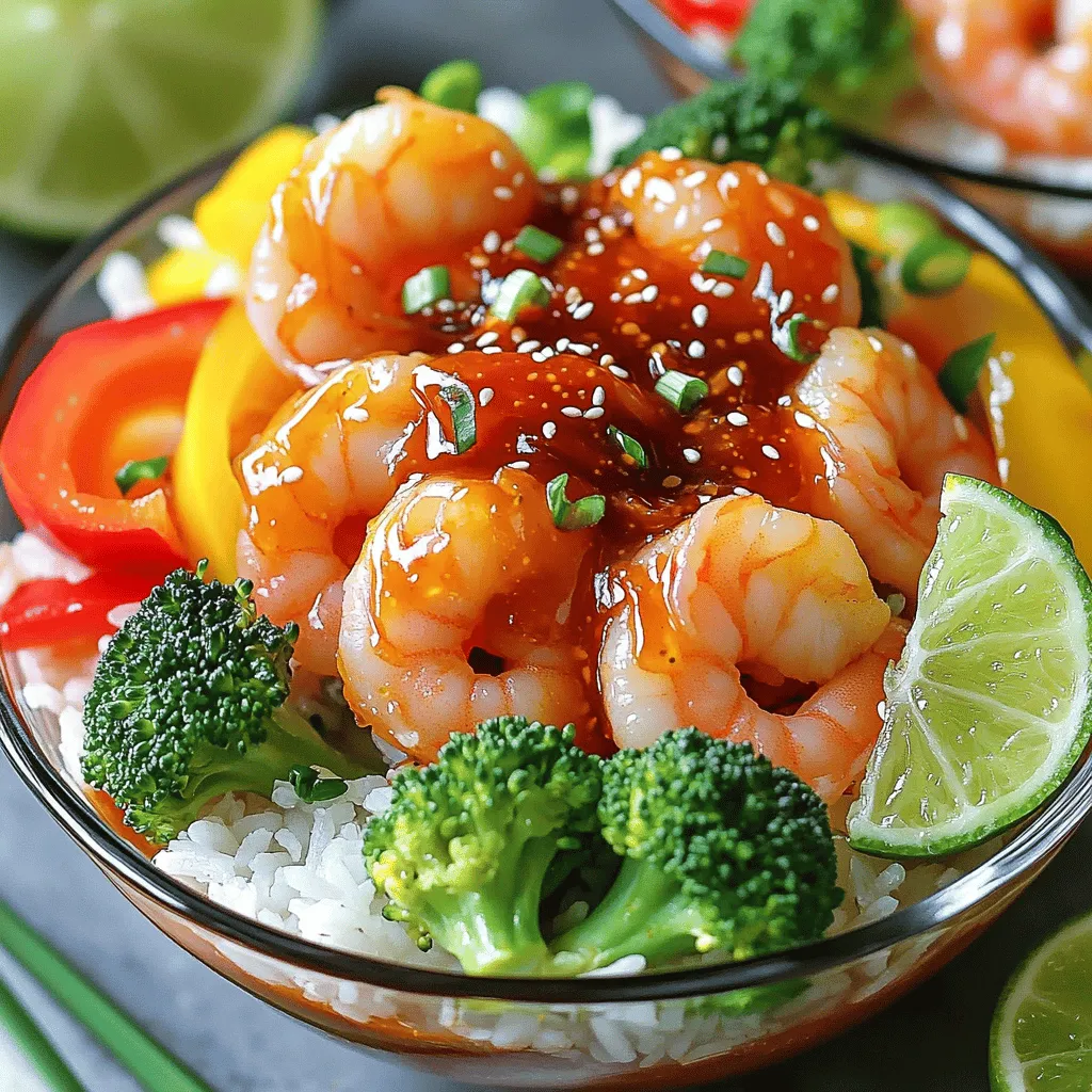 While the shrimp cooks, prepare your serving bowls. Portion out 2 cups of cooked jasmine rice or quinoa into each bowl. Top the rice with 1 cup of steamed broccoli florets and 1 cup of sliced bell peppers. Next, add the glazed shrimp on top of the veggies and rice. Finally, garnish each bowl with sliced green onions and a sprinkle of sesame seeds. This adds color and flavor to your dish.