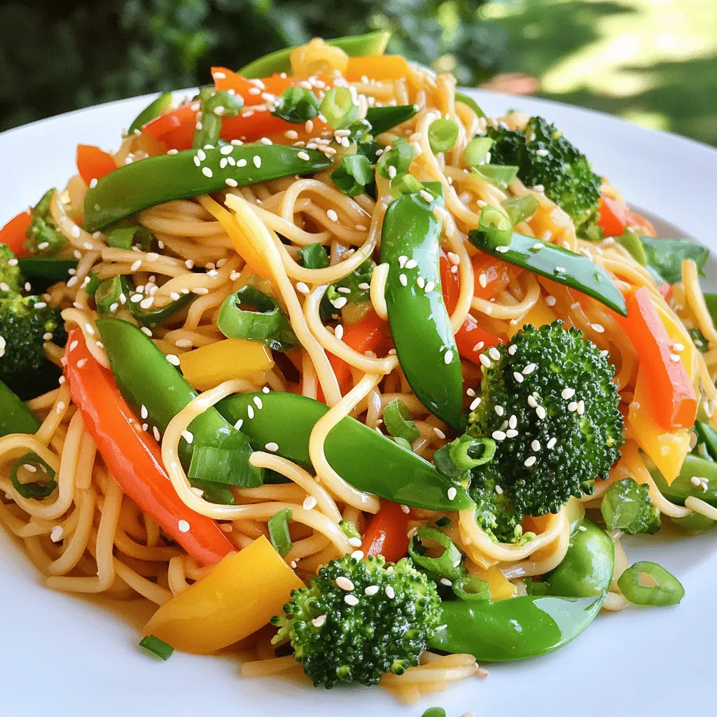 These ingredients are key to creating a colorful and flavorful dish. The lo mein noodles serve as the base. They soak up the tasty sauces well. The mix of bell peppers, snow peas, carrots, and broccoli gives great crunch and nutrition. Using sesame oil adds a rich, nutty flavor. Garlic and ginger bring warmth and spice. Lastly, the green onions and sesame seeds provide a fresh touch. This blend of ingredients makes your meal quick and exciting.