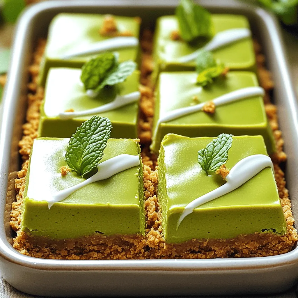 Once the whipped cream is mixed in, pour the matcha cheesecake filling over your chilled crust. Smooth out the top with a spatula. Cover the pan with plastic wrap and put it in the fridge. Let it chill for at least 4 hours, but overnight is best. This will help the squares set well. When ready, cut them into squares. For an extra touch, melt some white chocolate chips and drizzle over the top. Add fresh mint leaves for a nice look, too. Enjoy your delicious no-bake matcha cheesecake squares!