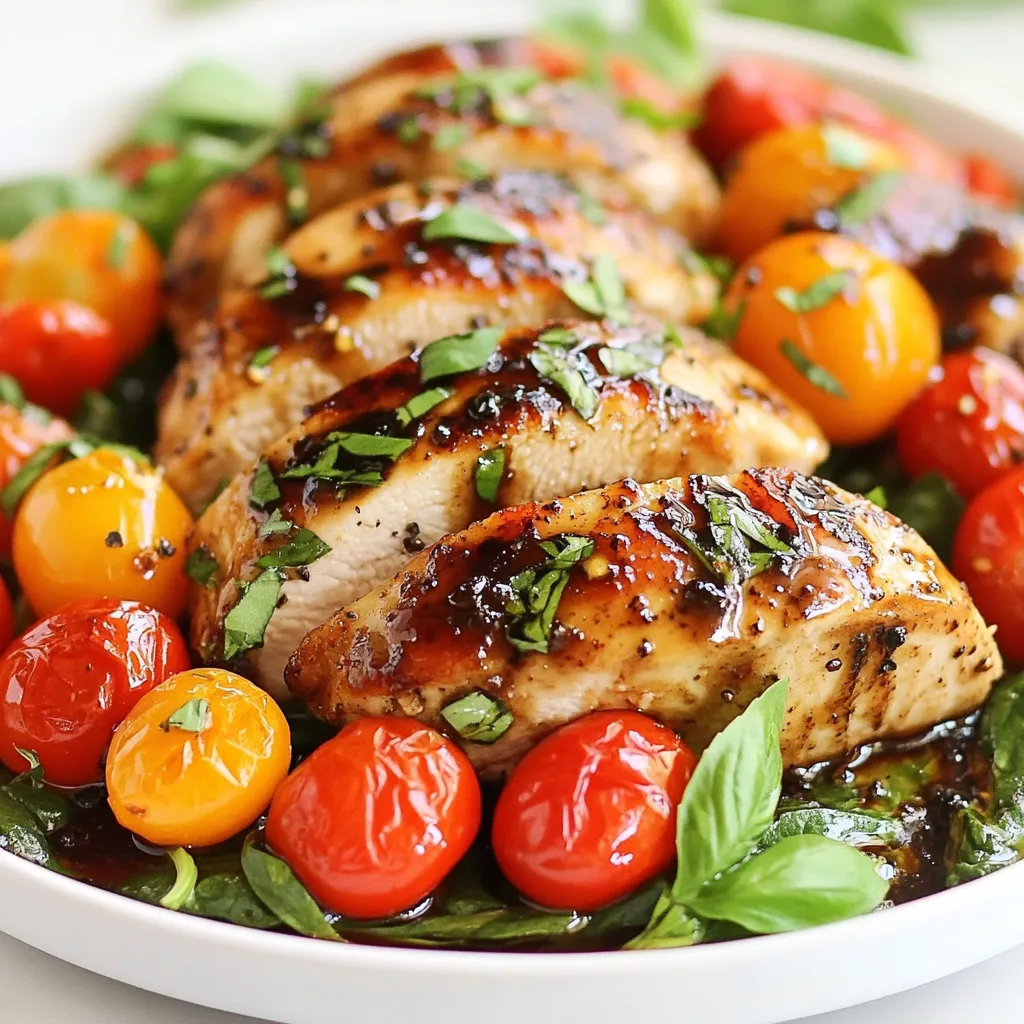 - 4 boneless, skinless chicken breasts - 1/2 cup balsamic vinegar - 1/4 cup honey - 2 tablespoons olive oil - 3 cloves garlic, minced - 1 teaspoon dried oregano - Salt and pepper to taste - 1 pint cherry tomatoes, halved - 2 cups fresh spinach - Fresh basil for garnish For this One Pan Balsamic Chicken meal, you need simple items. The chicken is the star. I use four boneless, skinless breasts. They cook well and stay juicy. Balsamic vinegar adds a tangy taste. Honey gives a nice sweetness. Together, they make a great marinade. You will need olive oil to cook the chicken. Garlic is a must for flavor. Dried oregano brings an herby touch. Don't forget salt and pepper to enhance the taste. For fresh veggies, I add halved cherry tomatoes and spinach. The tomatoes burst with juice while cooking. Spinach adds color and nutrients. Finally, fresh basil makes for a lovely garnish. It adds a bright flavor at the end. Each ingredient plays a part in this tasty dish. Trust me, you’ll love it! {{ingredient_image_1}} Whisk together balsamic vinegar, honey, olive oil, garlic, oregano, salt, and pepper. This mix adds a rich flavor to the chicken. Add the chicken breasts to the marinade. Make sure they are well coated. Let the chicken sit in the marinade for at least 30 minutes. For more flavor, refrigerate for up to 2 hours. Preheat your oven to 400°F (200°C). This step is key for even cooking. While the oven heats, take a large oven-safe skillet and place it on medium-high heat. This will help you get a good sear on the chicken. Remove the chicken from the marinade, saving it for later. Place the chicken in the skillet. Sear each side for 4-5 minutes. Look for a nice golden color. After searing, take out the chicken and set it aside. In the same skillet, add the halved cherry tomatoes. Cook them for about 2 minutes until they start to soften. Now, return the seared chicken to the skillet. Pour the reserved marinade over the chicken. Scatter fresh spinach around the chicken and tomatoes. The spinach will wilt down nicely in the oven. Transfer the skillet to the preheated oven. Bake for 20-25 minutes. Make sure the chicken reaches an internal temperature of 165°F (75°C). This ensures that the chicken is fully cooked and safe to eat. Once done, remove the skillet from the oven. Garnish with fresh basil for a pop of color and taste. Serve immediately, spooning the flavorful balsamic sauce and tomatoes over the chicken. This dish looks as good as it tastes! Marinating the chicken longer boosts the flavor. I suggest letting it sit for at least 30 minutes. If you have time, 2 hours in the fridge works wonders. You can also tweak the balsamic and honey amounts. If you like it sweeter, add more honey. For a tangy twist, increase the balsamic vinegar. A meat thermometer is your best friend. Check the chicken's internal temperature; it should reach 165°F (75°C). Once it's done baking, let the chicken rest for a few minutes. This makes the meat juicier and more flavorful. This dish shines with sides. Pair it with rice or quinoa for a filling meal. A fresh salad also works great and adds crunch. The vibrant colors of the chicken and veggies make your plate look beautiful too! Pro Tips Marination Time: The longer you marinate the chicken, the more flavorful it will be. Aim for at least 2 hours in the fridge for maximum taste. Use Fresh Ingredients: Fresh garlic and basil can elevate the dish's flavor profile significantly. Opt for fresh over dried whenever possible. Check Chicken Temperature: Always use a meat thermometer to ensure the chicken reaches an internal temperature of 165°F (75°C) for safe consumption. One Pan Wonder: This dish is versatile; feel free to add other vegetables like zucchini or bell peppers for added nutrition and flavor. {{image_2}} You can make this dish even healthier. Try using turkey instead of chicken. Boneless, skinless turkey breasts work great for this recipe. They keep the meal lean and tasty. If you want a different flavor, switch honey for brown sugar. Brown sugar adds a nice depth to the sauce. Feel free to boost the veggies in your dish. Adding bell peppers or zucchini gives more color and flavor. You can also top the chicken with crumbled feta cheese or creamy avocado. Both add a rich taste that pairs well with the balsamic sauce. You might want to adjust the number of servings. If you need more food, simply add more chicken breasts. To serve fewer people, use just one or two breasts. This makes it easy to customize the meal for your needs. Cool the chicken completely before storing. Place it in an airtight container. It will stay fresh for up to three days in the fridge. To reheat, use a skillet over low heat. You can also use the microwave. Add a splash of water or broth to keep it moist. Cover the dish while reheating to trap steam. You can freeze the balsamic chicken for up to three months. Make sure it cools fully before freezing. To thaw, place it in the fridge overnight. Reheat as mentioned above for best results. Yes, chicken thighs work well in this recipe. They add more flavor and stay juicy. If you prefer dark meat, thighs are a great choice. Just adjust the cooking time slightly, as thighs may take a bit longer to cook. Marinating enhances flavor but can be skipped for a quicker version. If you’re short on time, you can still make a tasty dish. Simply season the chicken with salt, pepper, and olive oil before cooking. The balsamic sauce will still add great flavor. You can serve this chicken with many sides. Try pairing it with: - Rice or quinoa - A fresh green salad - Roasted vegetables - Mashed potatoes These sides will complement the dish nicely and create a full meal. Checking for an internal temperature of 165°F (75°C) is key for doneness. Use a meat thermometer to check the thickest part of the chicken. If it reaches this temperature, it is safe to eat. Let the chicken rest a few minutes before serving to keep it juicy. This blog post covered a ta
