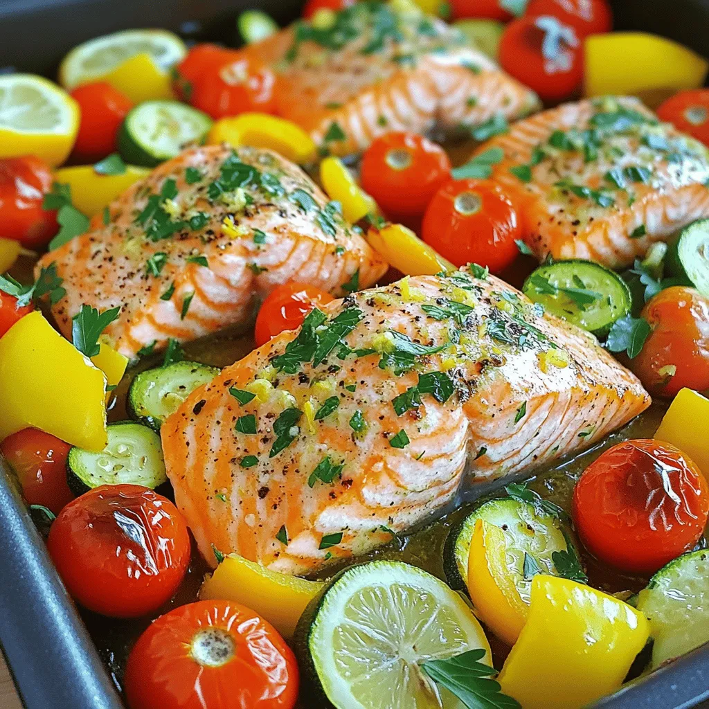 - 4 salmon fillets (about 6 oz each) - 2 cups cherry tomatoes, halved - 1 zucchini, sliced into half-moons - 1 red bell pepper, sliced into strips - 1 yellow bell pepper, sliced into strips - 3 tablespoons olive oil For this dish, I love using salmon fillets. They are rich in flavor and healthy. The cherry tomatoes add sweetness, while zucchini and bell peppers bring crunch and color. Olive oil is essential for roasting. It adds taste and helps the veggies cook perfectly. - 1 lemon, zested and juiced - 4 cloves garlic, minced - 1 tablespoon fresh thyme leaves (or 1 tsp dried thyme) - 1 tablespoon fresh dill, chopped (or 1 tsp dried dill) - Salt and pepper, to taste Lemon zest and juice brighten the dish. Garlic gives it depth. I like using fresh thyme and dill for a fresh taste. They pair well with salmon. Salt and pepper are key for balancing flavors. - Lemon wedges - Fresh parsley, chopped I always serve this dish with lemon wedges. They add a zesty kick. Fresh parsley not only looks nice, but it also enhances the flavor. Together, they make the meal pop visually and taste-wise. 1. Preheat your oven to 400°F (200°C). This step is key to getting a nice bake. 2. On a large baking sheet, arrange the cherry tomatoes, zucchini, and bell peppers. 3. Drizzle with 2 tablespoons of olive oil and sprinkle with salt and pepper. 4. Add half of the minced garlic and toss to mix well. 1. Create space in the center of the baking sheet for the salmon fillets. Place them skin-side down. 2. In a small bowl, mix the remaining olive oil, lemon zest, lemon juice, thyme, dill, salt, pepper, and the rest of the minced garlic. 3. Brush this flavorful mixture generously over the salmon fillets. 1. Bake in the preheated oven for 15-20 minutes. Check that the salmon is cooked through and flakes easily with a fork. The veggies should be tender. 2. Once done, take it out of the oven and let it rest for 5 minutes. This helps the flavors settle before serving. To check if your salmon is done, look for it to flake easily with a fork. The flesh should be opaque and not translucent. For alternative cooking methods, you can grill or pan-sear the salmon. Just make sure it cooks through evenly. When choosing vegetables, pick ones that are in season. Seasonal veggies taste better and are often more affordable. For roasting times, softer veggies like zucchini cook faster than harder ones like bell peppers. Adjust cooking times based on what you choose. Adding spices can really boost flavor. Try a pinch of paprika or a dash of cayenne for heat. If you don’t have fresh herbs, dried ones will work too. Just use less, as dried herbs are stronger than fresh ones. {{image_2}} You can swap salmon for other fish like cod or tilapia. These fish cook well and have a mild flavor. They will absorb the lemon and herb mix nicely. If you prefer chicken, use boneless, skinless chicken breasts. They take about the same time to cook as salmon. For a plant-based option, use firm tofu. Make sure to press it to remove extra water. Tofu will soak up all the tasty juices. You can add root vegetables to this dish for extra flavor and texture. Carrots or sweet potatoes work great. Just chop them into small pieces so they cook evenly. You can also try green veggies like asparagus or green beans. They add a nice crunch and bright color to the bake. Want to change up the taste? Try using different citrus fruits. Lime or orange can give the dish a fresh twist. You can also explore international spice blends. For example, a dash of curry powder or za'atar can bring new flavors to your salmon bake. Don't be afraid to mix and match your favorite spices! For leftover One-Pan Lemon Herb Salmon Veggie Bake, use airtight containers. Glass or plastic containers both work well. Make sure to cool the dish before sealing. Store it in the fridge for up to three days. This keeps the salmon and veggies fresh. To reheat, the best method is using the oven. Preheat your oven to 350°F (175°C). Place the salmon and veggies on a baking sheet. Cover them loosely with foil to keep moisture in. Heat for about 10 to 15 minutes. This helps maintain the flavor and texture of the dish. You can freeze this dish if you want to save some for later. For best results, freeze the components separately. Place salmon and veggies in freezer-safe bags. Remove as much air as possible. They can last up to two months in the freezer. When ready to enjoy, thaw overnight in the fridge. Reheat in the oven or microwave. This way, you can savor your meal without losing any taste. You should bake salmon fillets for 15 to 20 minutes at 400°F. This time allows the salmon to cook fully and flake easily with a fork. The key is to check for doneness. The salmon should be opaque and have a soft texture. If you like your salmon less cooked, you can remove it closer to 15 minutes. Yes, you can use frozen salmon! Just add a few extra minutes to the cooking time. For frozen fillets, bake for 20 to 25 minutes. Make sure to check the center for doneness. If it's still raw, give it a few more minutes. Thawing the salmon is not necessary, but it will cook more evenly if you do. You can serve many tasty sides with this dish. Here are some great options: - Quinoa or rice for a filling base - A fresh green salad for crunch - Roasted potatoes for a hearty touch - Garlic bread for some extra flavor - Steamed broccoli or asparagus for more veggies These sides will complement the salmon and veggies perfectly! In this post, we covered how to bake a delicious salmon veggie meal. We looked at key ingredients, including fresh salmon, vegetables, and herbs. I shared step-by-step instructions to guide you through preparation and baking. You also learned helpful tips, variations, and storage information. Baking salmon with veggies is simple and rewarding. You can easily customize it to your taste. Enjoy your cooking adventure, and remember, great meals start with fresh ingredients!