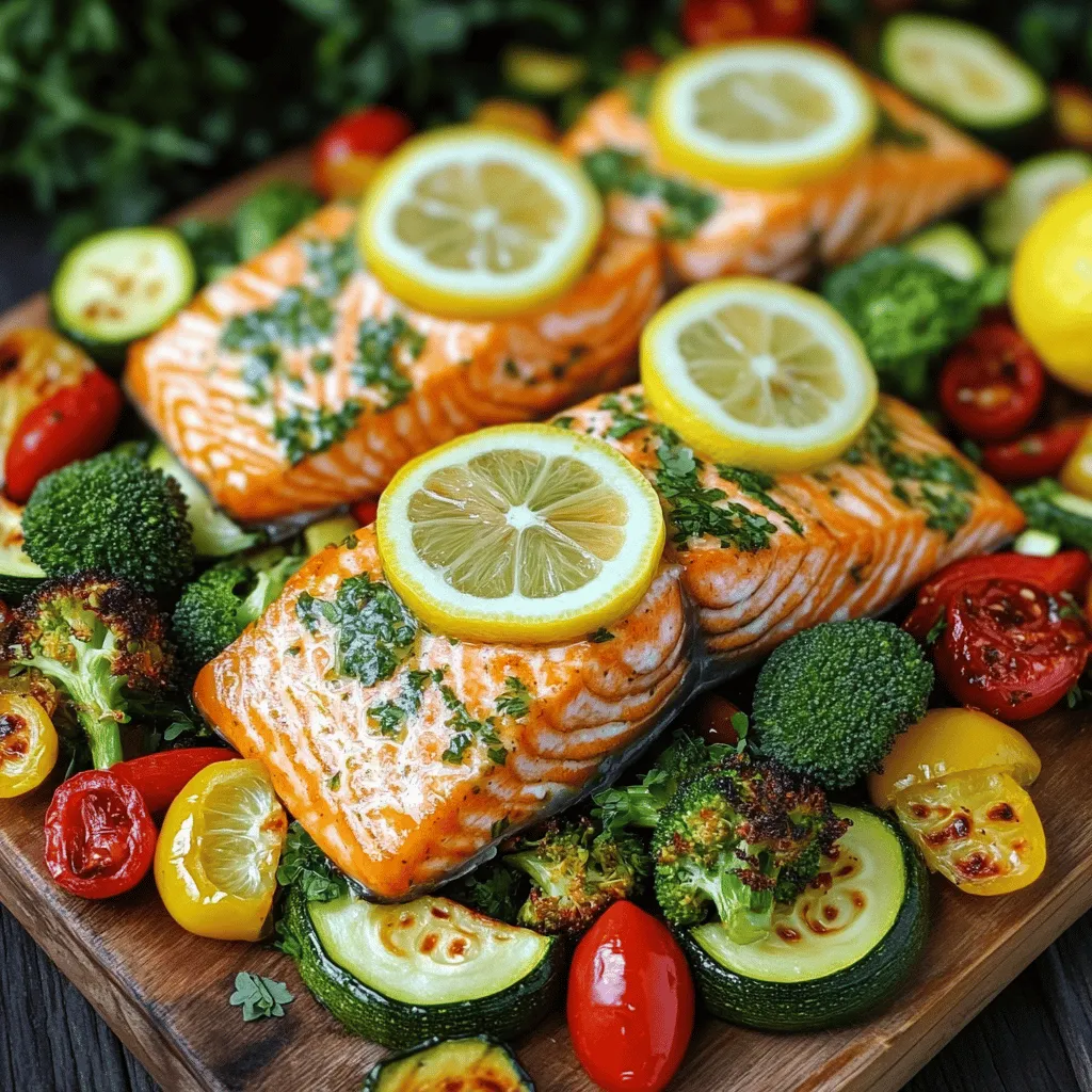 You need 4 salmon fillets for this dish. Look for fresh, vibrant fillets. They should be firm to the touch. Wild-caught salmon has great flavor, but farmed salmon works too. Each fillet gives a rich source of protein and healthy fats. For the veggies, gather: - 2 cups broccoli florets - 1 red bell pepper, sliced - 1 zucchini, sliced - 1 cup cherry tomatoes These vegetables add color and crunch. Broccoli gives a nice bite, while bell pepper adds sweetness. Zucchini brings moisture, and cherry tomatoes burst with flavor. You can mix and match these based on your taste. To make the marinade, you need: - 2 tablespoons olive oil - 2 lemons (1 for zest and juice, 1 sliced) - 3 cloves garlic, minced - 1 teaspoon dried thyme - 1 teaspoon dried rosemary - Salt and pepper to taste This marinade makes the salmon and veggies shine. Olive oil adds richness, and lemon gives a fresh zing. Garlic adds depth, while thyme and rosemary bring earthy notes. Salt and pepper enhance all these flavors. First, we need to set the stage for our dish. Preheat your oven to 400°F (200°C). This step is key for even cooking. While the oven warms up, grab a large baking sheet. Line it with parchment paper or foil for easy cleanup. This small step saves you time later. Now, let's whip up the marinade. In a small bowl, mix together 2 tablespoons of olive oil, the zest of 1 lemon, and the juice from the same lemon. Add 3 minced garlic cloves, 1 teaspoon of dried thyme, and 1 teaspoon of dried rosemary. Season with salt and pepper to taste. This mixture will add a burst of flavor to your salmon and veggies. With the marinade ready, it's time to set up the baking sheet. Place 4 salmon fillets in the center. Pour half of the marinade over the salmon, making sure it’s well coated. In another bowl, toss together 2 cups of broccoli florets, 1 sliced red bell pepper, 1 sliced zucchini, and 1 cup of cherry tomatoes. Drizzle the remaining marinade over the veggies and mix well. Spread the veggies around the salmon, without crowding them. For an extra touch, place lemon slices on top of the salmon and among the veggies. This will enhance the dish as it roasts. Now, pop the baking sheet in the oven and roast for 15-20 minutes. The salmon should flake easily with a fork, and the veggies should be tender. Enjoy! To cook salmon perfectly, timing is key. Bake it at 400°F for 15-20 minutes. Use a fork to check if it flakes easily. If it does, it is ready. Thicker fillets may need a few extra minutes. Always check the center; it should not be raw. To boost flavor, marinate your salmon well. Use lemon zest, juice, and garlic in your marinade. These add a fresh taste. Consider adding a pinch of chili flakes for heat. You can also try fresh herbs for a stronger flavor. Rosemary and thyme work great in this dish. For a lovely look, serve the salmon and veggies on a big platter. Add fresh herbs for color. Parsley or dill adds a nice touch. Place lemon wedges on the side for extra zest. This makes the dish pop and feel special. {{image_2}} You can swap out veggies for a new twist. Try asparagus for a crisp bite. Carrots add a sweet crunch. Green beans work well too, bringing color and flavor. You can even use squash for a different texture. Mix and match your favorites for fun! Want to change up the taste? Use dill or oregano for a fresh note. Paprika adds a hint of spice and smoke. You could also try a bit of cumin for warmth. Experimenting with fresh herbs can brighten up the dish in unique ways. If salmon isn't your thing, swap it out for chicken or tofu. Both cook well and soak up flavors nicely. Cod or tilapia are great fish choices too. Just keep an eye on cook times, as they may differ from salmon. Enjoy exploring these options! After enjoying your One-Pan Lemon Herb Salmon, you may have some leftovers. Store them in an airtight container. Make sure to keep the salmon and veggies together for the best flavor. Refrigerate them within two hours of cooking. They will stay fresh for up to three days. When you are ready to eat the leftovers, the best way to reheat them is in the oven. Preheat your oven to 350°F (175°C). Place the salmon and veggies on a baking sheet. Cover them with foil to keep moisture in. Heat for about 10-15 minutes, or until warm. You can also use a microwave if you're in a hurry. Place them in a microwave-safe dish and cover. Heat in short bursts, checking every 30 seconds, until warm. If you want to save some for later, you can freeze the leftovers. First, let the salmon and veggies cool completely. Then, wrap them tightly in plastic wrap or foil. Place the wrapped food in a freezer bag. Squeeze out as much air as possible before sealing. You can freeze them for up to three months. When you're ready to eat, thaw them overnight in the fridge before reheating. It takes about 15-20 minutes to cook salmon in the oven. The best way to know if it's done is to check if it flakes easily with a fork. Salmon cooks quickly, so keep an eye on it. The cooking time may change based on the thickness of the fillets. If you use thicker pieces, it may take a bit longer. Yes, you can use fresh herbs in place of dried ones. Fresh herbs add a bright taste to the dish. If you choose fresh thyme or rosemary, use about three times the amount. For example, if the recipe calls for one teaspoon of dried herbs, use three teaspoons of fresh herbs. This swap can enhance the flavor and give your meal a fresh twist. You can serve many sides with One-Pan Lemon Herb Salmon. Some great options include: - Rice or quinoa for a filling base. - A fresh salad to add crunch and color. - Garlic bread for a tasty side. - Mashed potatoes for comfort food lovers. These sides complement the lemon and herb flavors and make for a lovely meal. To sum up, we covered how to make a tasty one-pan lemon herb salmon dish. We discussed the key ingredients, including salmon, vegetables, and marinade. I walked you through each step, from prepping the oven to arranging e
