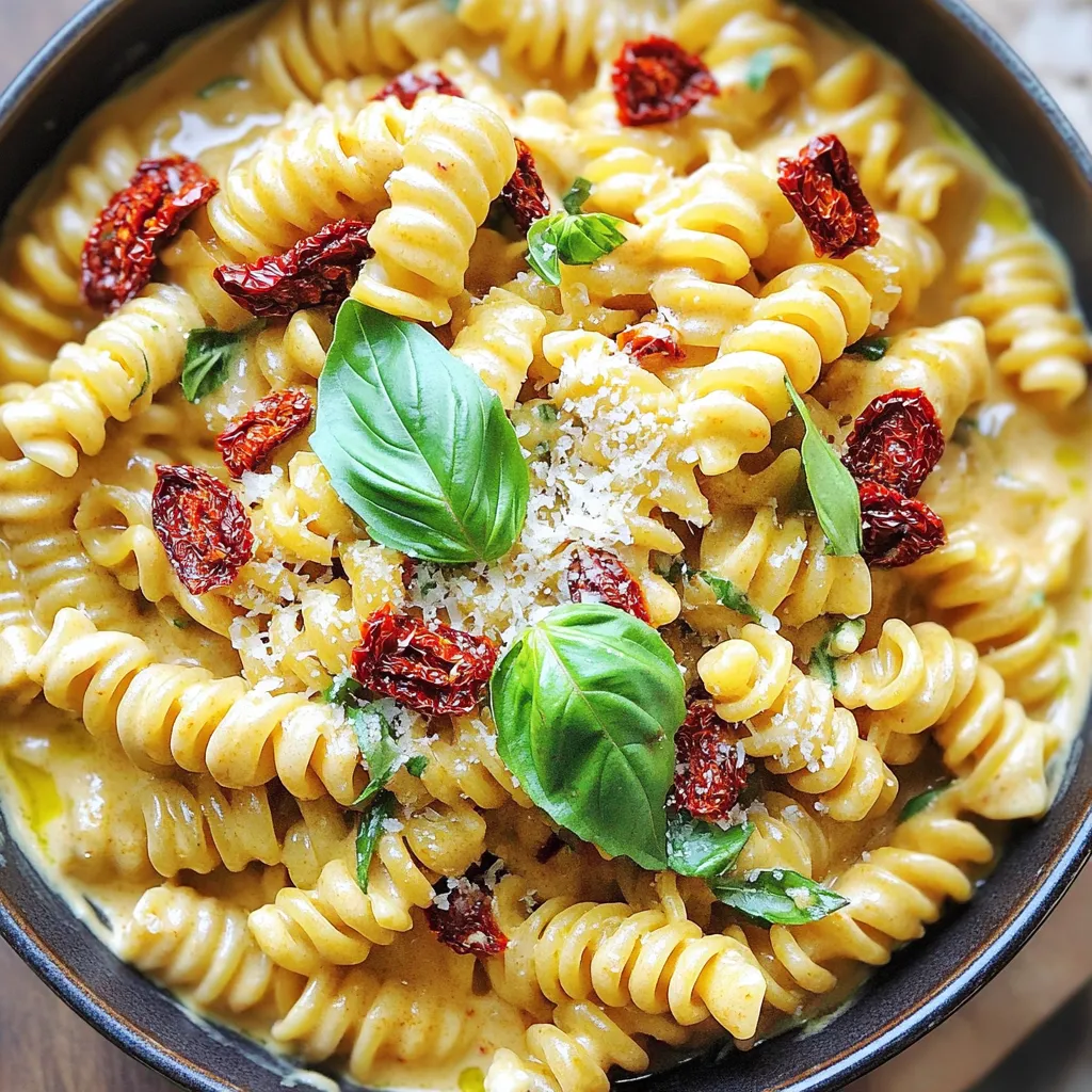 For this dish, I recommend using fusilli or penne pasta. Both shapes hold the creamy sauce well. Fusilli twists catch the sauce, while penne’s ridges help it cling. The sun-dried tomatoes are a must. I prefer the oil-packed kind. They add a rich, intense flavor. You can chop them up to mix well into the sauce. For the cheese, grated Parmesan is key. It melts beautifully and adds a nutty taste. Always choose a good-quality cheese for the best results. Garlic plays a vital role in this dish. It adds depth and a savory punch. Use fresh garlic for the best flavor. Italian seasoning combines herbs like oregano and basil. This blend enhances the overall taste. Don’t forget salt and pepper. They balance the flavors and bring everything together. Taste as you go to find the right amounts. Garnishing with fresh basil adds a pop of color and flavor. It brightens the dish and makes it look inviting. A drizzle of olive oil on top adds richness too. You can customize this recipe with different broths. Try chicken or vegetable broth based on your tastes. Each option brings a unique flavor to the sauce. To start, you need to prep your garlic and sun-dried tomatoes. Chop four cloves of garlic finely. This adds great flavor to your dish. Next, take one cup of sun-dried tomatoes, and chop them as well. If you use oil-packed tomatoes, you get extra flavor. Keep these ready for when you cook. Heat one tablespoon of olive oil in a large pot over medium heat. When the oil is hot, add the minced garlic. Sauté the garlic for about one minute until it smells good. Be careful not to burn it, as burnt garlic can taste bitter. After that, add the chopped sun-dried tomatoes. Stir them into the garlic and let them cook for another minute. Next, pour in one cup of chicken or vegetable broth. Bring this mixture to a gentle simmer. Once it starts bubbling, add 12 ounces of pasta, like fusilli or penne. Make sure the pasta is fully submerged in the broth. Cover the pot and cook the pasta according to the package instructions, usually about 10 to 12 minutes. Stir occasionally to keep it from sticking. Once the pasta is al dente, lower the heat. Stir in one cup of heavy cream and one teaspoon of Italian seasoning. Mix everything well until it’s combined. Then, slowly add one cup of grated Parmesan cheese. Keep stirring until the cheese melts and the sauce becomes creamy. You might want to season with salt and pepper to taste. If the sauce feels too thick, add a splash of extra broth or water. Let the dish sit for 2 to 3 minutes. This allows the sauce to thicken a bit more and enhances the creamy texture. Enjoy your one-pot creamy sun-dried tomato pasta! To cook perfect al dente pasta, follow these steps: - Use plenty of salted water. This helps flavor the pasta. - Bring the water to a full boil before adding pasta. - Stir the pasta a few times while cooking. This prevents it from sticking. - Check the package for the cooking time. Aim for the lower time for al dente. - Taste a piece a minute before the time is up. It should be firm but not hard. Stirring during cooking is key. It helps the pasta cook evenly. If you don’t stir, the pasta can clump together. This can lead to uneven cooking. So, give it a gentle stir every few minutes! Using high-quality olive oil makes a big difference. It adds richness to the dish. I recommend looking for extra virgin olive oil. Its flavor is fruity and robust. This will elevate the taste of your pasta. For extra flavor, consider adding red pepper flakes. Just a pinch can add a nice kick. You can also mix in fresh herbs like thyme or oregano. They pair well with sun-dried tomatoes and cream. When serving, choose deep bowls. This keeps the pasta warm. Garnish with fresh basil leaves. They add color and a fresh taste. A sprinkle of extra Parmesan cheese enhances the look too. Pair your pasta with a crisp salad or warm bread. A simple green salad with vinaigrette works great. The crispness of the salad balances the creaminess of the pasta. Enjoy your meal! {{image_2}} You can easily switch up the pasta type. Fusilli and penne work well, but feel free to use rotini or farfalle. Each shape holds sauce differently, so try what you like best. For vegetarian options, consider using plant-based cheeses or broths. Nutritional yeast can add a cheesy flavor without dairy. Want to boost protein? Adding diced chicken or shrimp makes the dish heartier. Cook them in the pot before adding the garlic. You can also toss in fresh spinach or zucchini. These veggies add color and nutrients without overpowering the dish. If you need gluten-free options, use gluten-free pasta. It cooks the same way and absorbs the sauce well. For dairy-free alternatives, try coconut cream or cashew cream instead of heavy cream. Nutritional yeast can replace Parmesan cheese for flavor. These swaps ensure everyone can enjoy this creamy delight! To store your leftover creamy sun-dried tomato pasta, let it cool first. Place it in airtight containers. This helps keep the pasta fresh and tasty. Make sure to use containers that seal well to avoid any spills or air exposure. When you're ready to enjoy leftovers, reheat gently. Use a stove or microwave. For the stove, add a splash of broth or water to keep it creamy. Stir well as it heats. In the microwave, cover with a damp paper towel to trap steam. This keeps the pasta moist. If you want to save some for later, freezing is a great option. Let the pasta cool completely, then transfer it to freezer-safe bags. Remove as much air as possible to prevent freezer burn. To thaw, place it in the fridge overnight. Reheat it on the stove or microwave, adding a little liquid if needed. To thicken the sauce, you have a few options. First, you can reduce the sauce by simmering it longer to drive off some liquid. Second, add more cheese. Parmesan is a great choice. It melts well and adds creaminess. Lastly, mix in a bit of cornstarch or flour. Just dissolve it in water first before adding it 