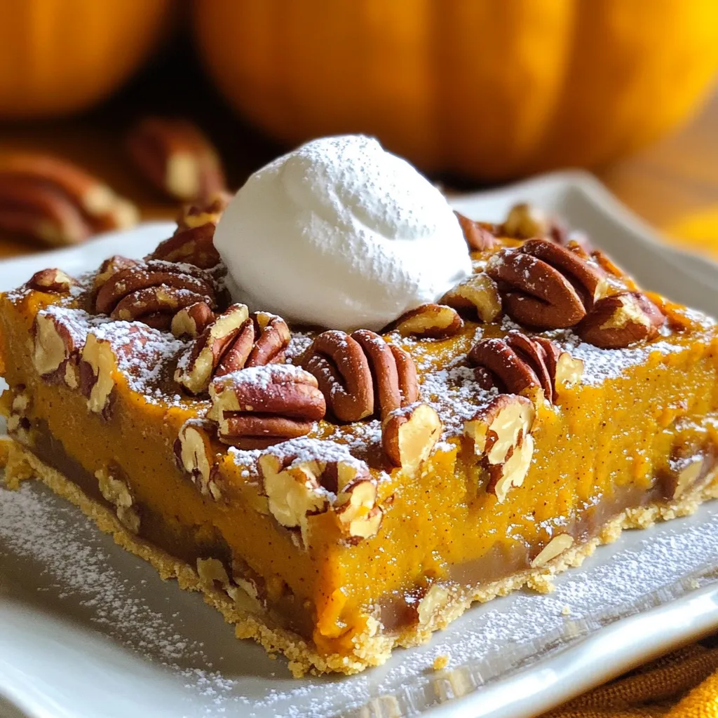 - 1 ½ cups all-purpose flour - ½ cup brown sugar - ½ teaspoon salt - ¾ cup unsalted butter, melted - 1 cup pumpkin puree - 1 cup sweetened condensed milk - 2 large eggs - 1 teaspoon vanilla extract - 1 teaspoon ground cinnamon - ½ teaspoon ground nutmeg - ½ teaspoon ground ginger - 1 cup chopped pecans - Extra pecan halves for topping I recommend measuring the flour carefully. Use a spoon to scoop it into your cup, then level it off. This helps avoid too much flour, which can make your bars dense. The butter should be melted but not too hot, or it might cook the eggs in the filling. You can swap the all-purpose flour with a gluten-free blend. Just make sure it works for baking. If you want less sweetness, try using less sweetened condensed milk or a sugar-free version. Instead of pecans, walnuts work well too. They give a nice crunch and flavor. If you do not have pumpkin puree, you can use mashed sweet potatoes or butternut squash. Just ensure they are smooth and not too watery. First, set your oven to 350°F (175°C). This heat will bake the bars just right. Next, grab a 9x13 inch baking dish and grease it lightly. This step helps the bars lift out easily later. In a medium bowl, mix 1 ½ cups of all-purpose flour, ½ cup of brown sugar, and ½ teaspoon of salt. Then, pour in ¾ cup of melted unsalted butter. Use a fork to blend until the mix looks crumbly. Now, press this mixture firmly into the bottom of your greased baking dish. Bake this crust in your preheated oven for 15 minutes. Once done, take it out and let it cool for a bit. In a large bowl, whisk together 1 cup of pumpkin puree, 1 cup of sweetened condensed milk, and 2 large eggs. Add 1 teaspoon of vanilla extract to the mix. Beat it until everything is smooth and creamy. Next, stir in 1 teaspoon of ground cinnamon, ½ teaspoon of ground nutmeg, and ½ teaspoon of ground ginger. Make sure all the spices mix well. Finally, fold in 1 cup of chopped pecans gently. Pour the pumpkin filling over the cooled crust. Spread it out evenly to cover all the crust. For a nice touch, add extra pecan halves on top and press them down lightly. Bake the bars in the oven for another 25-30 minutes. You will know they are ready when the center is set and a toothpick comes out clean. Let the bars cool completely in the pan before cutting them into squares. Enjoy your delicious pumpkin pecan pie bars! To get a great crust, use cold butter. This keeps the crust flaky. Mix the flour, brown sugar, and salt first. Then add the melted butter. Press the mixture firmly into your baking dish. Bake it until it is lightly golden. This takes about 15 minutes. To make your bars pop with flavor, use fresh spices. Ground cinnamon is a must. Add nutmeg and ginger for warmth. You can also adjust the amount to your taste. If you like it spicier, add a bit more ginger. Mix the spices well with the pumpkin filling for even flavor. Make your bars look great on the plate. Dust them with powdered sugar right before serving. Add a dollop of whipped cream or a scoop of vanilla ice cream. This makes them extra special. For a nice touch, place some pecan halves on top. It adds color and crunch. {{image_2}} You can make these bars gluten-free easily. Use almond flour or a gluten-free flour blend. Replace the all-purpose flour in the crust with your chosen alternative. Make sure to check that all other ingredients are also gluten-free. This way, everyone can enjoy these tasty treats without worry. For a fun twist, add chocolate or caramel. Swirl in some chocolate chips into the pumpkin filling before baking. You can also drizzle caramel sauce on top after baking. Both options add a sweet richness. They make each bite even more delightful. You can change the spices to fit the season. For winter, try adding cloves or cardamom. These spices give a warm and cozy flavor. In the fall, add a bit of allspice for extra warmth. Each variation can make the bars feel fresh and exciting throughout the year. To store these delicious bars, let them cool completely. Then, cut them into squares. Place the squares in an airtight container. You can keep them in the fridge for up to a week. For best taste, enjoy them within the first few days. If you want to save some bars for later, freezing works great. Wrap each square in plastic wrap. Then, place them in a freezer bag or container. Make sure to label it with the date. These bars can last in the freezer for up to three months. When you’re ready to eat, just thaw them in the fridge overnight. To enjoy your bars warm, preheat your oven to 350°F (175°C). Place the squares on a baking sheet. Heat them for about 10-15 minutes. You can also microwave them for about 20-30 seconds. Just be careful not to overheat, or they may get tough. Enjoy your cozy treat! Yes, you can use fresh pumpkin. Roast the pumpkin until soft, then puree it. This gives a fresh taste. Just make sure you remove all the water. Too much water can make the bars soggy. The bars are done when the center is set. You can test this with a toothpick. Insert it into the filling. If it comes out clean, the bars are ready. They should have a slight jiggle but not be liquid. These bars pair well with whipped cream or vanilla ice cream. A sprinkle of powdered sugar adds a nice touch. You can also serve them with a hot cup of coffee or tea. They make a lovely treat for fall gatherings. The bars last about 5 to 7 days in the fridge. Store them in an airtight container to keep them fresh. If you want them to last longer, consider freezing them. They freeze well for up to 3 months. In this post, we explored how to make delicious Pumpkin Pecan Pie Bars. We covered the key ingredients, detailed step-by-step instructions, and shared valuable tips. You learned about variations and storage options too. Making these bars can be easy and fun. Remember, small changes can lead to big flavors. Enjoy the process and share your creations with others. You’ll love how these bars taste, and so 