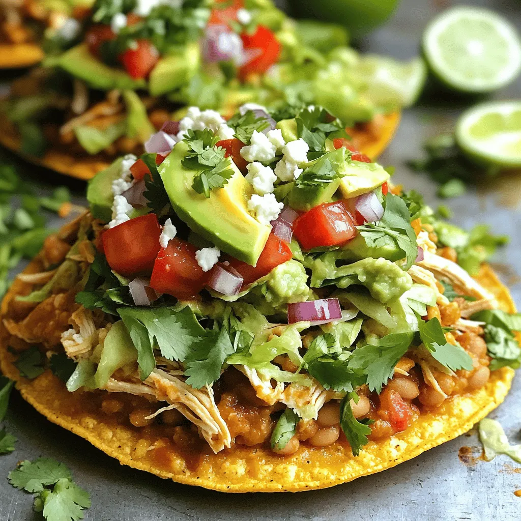 You need tostada shells as the base. They are crunchy and hold all the toppings well. Rotisserie chicken offers great flavor and saves time. You can use store-bought or homemade refried beans for a tasty layer. Fresh toppings like lettuce, tomatoes, and onion add crunch and color. Avocado brings creaminess, while queso fresco adds a salty touch. Fresh cilantro gives a pop of flavor, and lime juice boosts freshness.
