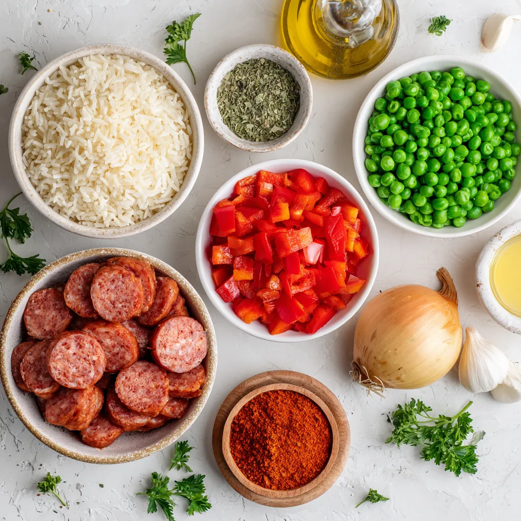 1. Start by gathering all your ingredients. You need spicy chicken sausage, rice, chicken broth, bell pepper, onion, garlic, smoked paprika, oregano, frozen peas, olive oil, salt, and pepper.