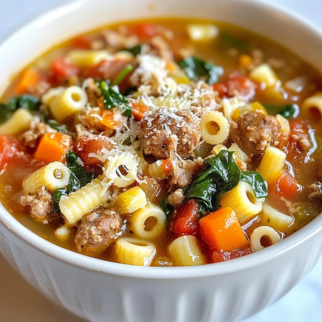 - 1 pound Italian sausage, casings removed - 1 medium onion, diced - 3 cloves garlic, minced - 1 carrot, diced - 1 celery stalk, diced - 6 cups chicken broth - 1 can (14.5 oz) diced tomatoes - 2 cups fresh spinach - 1 cup small pasta (such as ditalini or elbow macaroni) - 1 teaspoon dried oregano - 1 teaspoon dried basil - Salt and pepper - 2 tablespoons olive oil - Grated Parmesan cheese for serving To create a warming bowl of sausage pasta soup, gather all these fresh ingredients first. The Italian sausage gives a rich flavor. Diced onions and garlic add depth. Carrots and celery provide a nice crunch. Chicken broth is the base of the soup, while diced tomatoes bring brightness. Fresh spinach adds color and nutrients. Small pasta makes the soup hearty and filling. Dried oregano and basil provide classic Italian flavor. Don't forget salt and pepper to taste. Lastly, some olive oil helps everything cook nicely. - Vegetables (e.g., bell peppers, zucchini) - Beans (e.g., cannellini or kidney beans) - Different types of sausage You can personalize your soup! Add bell peppers or zucchini for extra veggies. Beans like cannellini or kidney can boost the fiber. If you want a twist, try different types of sausage. Each choice will change the flavor and texture. Enjoy creating your own unique version! {{ingredient_image_1}} First, heat olive oil in a large pot over medium heat. Add 1 pound of Italian sausage to the pot. Cook the sausage for about 5 to 7 minutes. You want it browned and fully cooked. Use a spoon to break it up as it cooks. This helps the sausage mix well with the soup later. Next, it’s time to add the diced onion, minced garlic, diced carrot, and diced celery. Sauté these vegetables for about 5 minutes. Look for them to soften and start to smell good. This step builds a strong base for your soup’s flavor. Once the vegetables are ready, pour in 6 cups of chicken broth. Then, add a can of diced tomatoes. Sprinkle in 1 teaspoon each of dried oregano and dried basil. Stir everything to mix. Bring this mixture to a boil. This will create a rich soup base. When the broth is boiling, add 1 cup of small pasta, like ditalini or elbow macaroni. Reduce the heat to let it simmer. Cook the pasta for about 8 to 10 minutes. Keep an eye on it to ensure it cooks to al dente, which means it should be firm but not hard. After the pasta is done, stir in 2 cups of fresh spinach. Let the spinach wilt in the soup for about 2 minutes. Finally, taste the soup and adjust the seasoning with salt and pepper. This step is key to perfecting the flavor. Serve your soup hot. I recommend garnishing with grated Parmesan cheese on top. It adds a nice finish. You can also enjoy it with some crusty bread or a fresh salad on the side. This makes for a hearty, satisfying meal! To balance spices in your sausage pasta soup, start with less and add more. Taste as you go. This helps you find the right mix. For fresh herbs, use basil and parsley. They brighten the soup and add freshness. You can add them at the end for the best flavor. To avoid overcooked pasta, add it later in the cooking process. This keeps it firm. Cook it just until al dente, then remove the pot from heat. For vegetables, cut them small so they cook evenly. Sauté them until they are soft but still hold their shape. This adds texture and color to your soup. Prep ingredients in advance. Chop your vegetables and store them in the fridge. This saves time on busy days. You can also use leftover ingredients. If you have extra veggies or meats from other meals, toss them in. This is a great way to reduce waste and add flavor. Pro Tips Use Fresh Herbs: Fresh herbs like basil and oregano elevate the flavor of the soup significantly compared to dried herbs. Customize Your Pasta: Feel free to swap out the small pasta for whole grain or gluten-free options for a healthier twist. Add Spice: For a kick, add red pepper flakes or a dash of hot sauce to the soup when seasoning. Make It Ahead: This soup holds up well in the fridge, making it perfect for meal prep. Just add fresh spinach before serving. {{image_2}} You can switch the sausage type for a healthier meal. Turkey or chicken sausage works well. They offer a lighter taste without losing flavor. If you prefer a meat-free dish, consider using plant-based sausage. These veggie options give the same great taste and texture. The pasta shape you choose can change the soup's feel. Small pasta shapes like ditalini or elbow macaroni hold the broth well. You can also use larger shapes if you prefer. If you need gluten-free options, use gluten-free pasta. They cook similarly and still taste great. To spice things up, try using spicy sausage. It adds heat and depth to the soup. If you want a creamier soup, add a splash of heavy cream at the end. This makes the soup rich and comforting. Adjust flavors as you like to make it your own. To store your leftover Sausage Pasta Soup, first let it cool. Then, pour it into an airtight container. This keeps air out and helps the soup stay fresh. You can keep it in the fridge for up to four days. Just make sure to check for any off smells before eating. If you want to freeze the soup, follow these steps: - Let it cool completely. - Use freezer-safe containers or bags. - Leave some space at the top for expansion. You can freeze it for up to three months. When you're ready to eat, thaw it in the fridge overnight. Reheat it on the stove over medium heat. Stir it well to ensure it heats evenly. You can make Sausage Pasta Soup ahead of time for easy meals. Cook a big batch and store it in the fridge or freezer. Portion it out into single servings for quick access. This way, you always have a hearty meal ready when you need it. Just heat and enjoy! Sausage Pasta Soup can last in the fridge for about 3 to 4 days. Store it in an airtight container to keep it fresh. When reheating, make sure it’s hot all the way through. Yes, you can make Sausage Pasta Soup in a slow cooker. Brown the sa