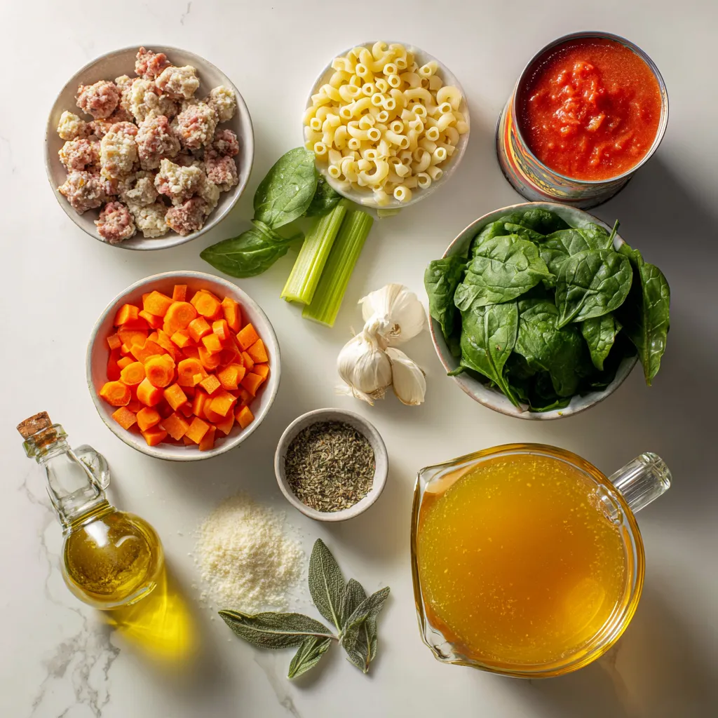 To create a warming bowl of sausage pasta soup, gather all these fresh ingredients first. The Italian sausage gives a rich flavor. Diced onions and garlic add depth. Carrots and celery provide a nice crunch. Chicken broth is the base of the soup, while diced tomatoes bring brightness. Fresh spinach adds color and nutrients. Small pasta makes the soup hearty and filling. Dried oregano and basil provide classic Italian flavor. Don’t forget salt and pepper to taste. Lastly, some olive oil helps everything cook nicely.