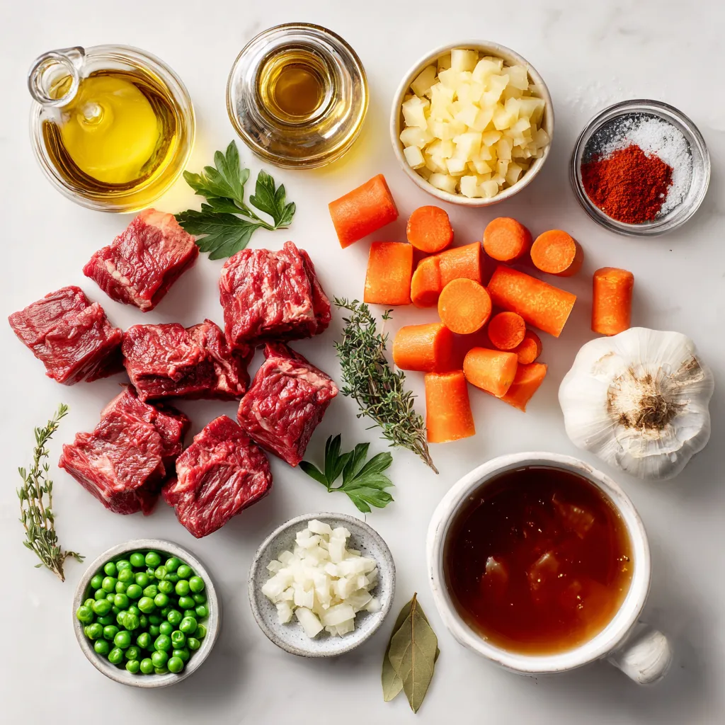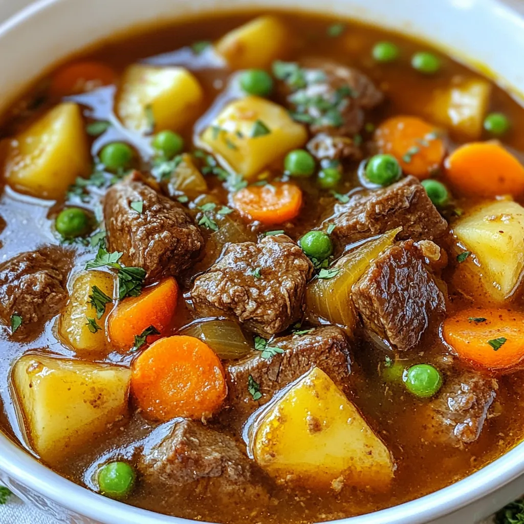 You will need some key items for a tasty beef stew. Here’s what to gather: - 2 pounds beef chuck, cut into 1-inch cubes - 4 medium carrots, sliced - 3 medium potatoes, diced - 1 onion, diced - 4 cloves garlic, minced - 4 cups beef broth - 2 tablespoons tomato paste - 1 tablespoon Worcestershire sauce - 1 teaspoon dried thyme - 1 teaspoon paprika - 1 bay leaf - Salt and pepper to taste - 2 tablespoons olive oil - 1 cup frozen peas These ingredients form the base of your stew. The beef chuck gives it a rich flavor. The carrots and potatoes add sweetness and heartiness. You may want to add some extra flavors. Here are some optional items: - Red wine for depth - Bay leaves for herbal notes - A pinch of chili powder for some heat Using these can change the flavor profile. A splash of red wine can add a nice touch. Garnishing makes the dish pop. Here’s what you can use: - Fresh parsley, chopped - Sliced green onions - A sprinkle of black pepper These garnishes add color and freshness. They make your stew look as good as it tastes. {{ingredient_image_1}} Start by cutting 2 pounds of beef chuck into 1-inch cubes. This cut has great flavor and tenderness. Next, heat 2 tablespoons of olive oil in a large skillet over medium-high heat. Season the beef cubes with salt, pepper, and 1 teaspoon of paprika. Sear the beef in batches for about 5 minutes. Make sure to brown all sides evenly. This step builds flavor. While the beef cooks, chop 4 medium carrots, 3 medium potatoes, and 1 onion. Mince 4 cloves of garlic. Once the beef is browned, transfer it to the slow cooker. Now, layer the carrots, potatoes, onion, and garlic on top of the beef. This order helps the vegetables cook perfectly. In a separate bowl, mix 4 cups of beef broth, 2 tablespoons of tomato paste, 1 tablespoon of Worcestershire sauce, 1 teaspoon of dried thyme, and 1 bay leaf. Add a pinch of salt and pepper. Pour this mixture over the layered ingredients in the slow cooker. Set the slow cooker to low heat and cook for 8 hours. If you're short on time, you can also cook it on high heat for 4 hours. The beef will be tender and the flavors will blend beautifully. About 30 minutes before serving, stir in 1 cup of frozen peas. This adds color and sweetness. Before you serve, remove the bay leaf and check the seasoning. Adjust salt and pepper as needed. Enjoy your hearty stew! To make your beef stew taste great, start with good meat. I use beef chuck. It has fat that keeps the meat tender. Sear the beef before adding it to the slow cooker. This step adds a rich flavor. Don't skip this! Use fresh herbs if you can. Thyme works well and adds depth. You can also try adding a splash of red wine. It gives the stew a nice kick. Make sure to layer your ingredients right. Put the beef at the bottom. Then add the vegetables on top. This way, the beef cooks in its juices. Let the stew cook on low heat for the best texture. Eight hours is ideal. The meat will fall apart and taste amazing. One big mistake is not seasoning enough. Add salt and pepper at each step. Taste as you go. It helps to build flavor. Another mistake is overcooking the vegetables. If you add them too soon, they get mushy. Add softer veggies like peas later, about 30 minutes before serving. Also, don’t rush the searing process. If you crowd the pan, the beef won’t brown well. Sear in batches for even cooking. For this recipe, you need a good slow cooker. A 6-quart model works well for family meals. A large skillet is great for searing the beef. Use a heavy-bottomed pot for better heat control. Don't forget a sharp knife for chopping. A cutting board helps keep your space clean. Finally, have measuring cups and spoons ready. They ensure you add just the right amounts. Pro Tips Choose the Right Cut: For a tender stew, use beef chuck or brisket. These cuts become flavorful and tender when cooked low and slow. Don’t Skip the Browning: Searing the beef before adding it to the slow cooker enhances the flavor of the stew significantly. Adjust Seasoning Wisely: Taste the stew before serving and adjust the seasoning to your liking; the flavors develop over the cooking time. Thicken if Desired: If you prefer a thicker stew, mix a tablespoon of cornstarch with cold water and stir it into the stew 30 minutes before serving. {{image_2}} To make a gluten-free beef stew, you need to choose the right broth. Use a gluten-free beef broth. Brands like Pacific Foods or Kitchen Basics offer great options. Avoid any products with wheat or gluten. Check your Worcestershire sauce, too. Some brands use gluten. You can also add more veggies. Try sweet potatoes or parsnips. They add flavor and texture. For a low-carb beef stew, skip the potatoes. Instead, use turnips or cauliflower. Both will give you that hearty feel. You can also add more greens, like kale or spinach. They cook down well and add nutrition. Another tip is to use less broth. This will help keep the stew thick and satisfying. If you want a vegetarian stew, replace the beef with hearty mushrooms. Portobello or cremini mushrooms work best. They have a meaty texture and rich flavor. Use vegetable broth instead of beef broth. Add more beans, like kidney or chickpeas, for protein. You can also throw in lentils. They cook down nicely and add bulk. Don't forget to adjust the seasoning. You want it to taste great! After enjoying your savory slow cooker beef stew, let it cool to room temperature. Then, place it in an airtight container. Store it in the fridge for up to three days. You can also keep it in a bowl, covering it with plastic wrap. Make sure to label the container with the date. When you are ready to enjoy the leftovers, reheat them gently. Use a pot on the stove over low heat. Stir often to ensure even heating. You can also microwave it in short bursts. Cover the bowl with a microwave-safe lid or wrap. This keeps the steam in, helping the stew heat evenly. For longer storage, freezing is a great option. Pour the cooled stew into free