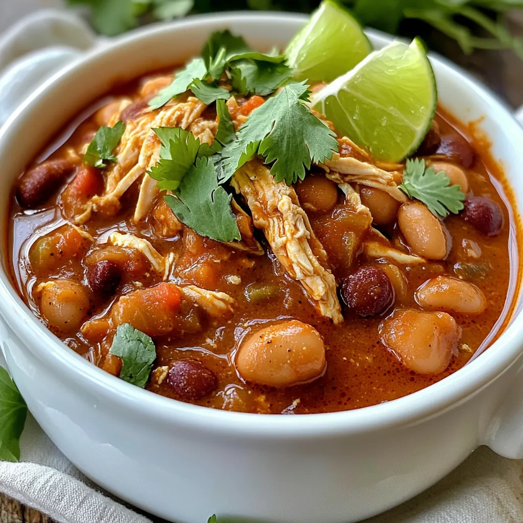 - 1 lb boneless, skinless chicken thighs, diced - 1 can (15 oz) black beans, drained and rinsed - 1 can (15 oz) kidney beans, drained and rinsed - 1 can (28 oz) crushed tomatoes The main ingredients form the heart of this chili. I love using chicken thighs because they stay juicy and tender. The black beans and kidney beans add protein and texture. Crushed tomatoes give a rich base and a nice depth of flavor. - 1-2 chipotle peppers in adobo sauce, minced (adjust for spice level) - 1 tablespoon adobo sauce from the chipotle can - 1 teaspoon smoked paprika - 1 teaspoon ground cumin - Fresh cilantro, for garnishing - Lime wedges, for serving For flavor, I use chipotle peppers in adobo sauce. They add a smoky kick. Smoked paprika and ground cumin deepen the taste. Fresh cilantro brightens the dish, while lime juice adds zest. - 1 bell pepper (red or green), diced - Seasonings for personal taste Diced bell peppers give a nice crunch and sweetness. You can adjust seasonings based on your taste. Feel free to add garlic, onion, or even some hot sauce for extra heat. First, gather all your ingredients. Start by dicing 1 pound of boneless, skinless chicken thighs into small pieces. This helps the chicken cook evenly and absorb flavors. Next, dice one medium onion and one bell pepper. You can choose red or green, based on your taste. Now, mince three cloves of garlic. This adds a strong, rich flavor to your chili. For a smoky kick, mince 1-2 chipotle peppers in adobo sauce. Adjust the amount based on how spicy you want your chili. Don’t forget to scrape out some adobo sauce from the chipotle can as well! Now it’s time to layer your slow cooker. Start by placing the diced chicken thighs at the bottom. This allows the juices to soak into the chicken as it cooks. Next, layer in the drained black beans and kidney beans. Pour the 28-ounce can of crushed tomatoes on top. Then, add the diced onion, minced garlic, and bell pepper. Stir in the minced chipotle peppers, adobo sauce, smoked paprika, and ground cumin. These ingredients blend well, creating a rich, smoky flavor. Finally, pour in 2 cups of chicken broth. This keeps everything moist while cooking. Set your slow cooker to low for 6-8 hours or high for 3-4 hours. Cooking on low makes the chicken very tender. When the time is up, check that the chicken is cooked through. Use two forks to shred the chicken right in the pot. Mix it all well to combine. Before serving, taste your chili. Adjust salt and pepper if needed. This ensures your chili has the perfect flavor. Enjoy your savory creation! Managing the heat in your chili is key. Chipotle peppers give a smoky flavor and heat. Start with one pepper and taste. If you want more spice, add another. You can also try other spices. Cumin can add warmth without too much heat. Smoked paprika brings depth without the burn. For the best results, follow the cooking times closely. Cook on low for 6 to 8 hours for tender chicken. If you’re short on time, cook on high for 3 to 4 hours. To ensure your chicken is tender, check it before serving. It should shred easily with two forks. Garnishing makes your chili look nice. Top each bowl with fresh cilantro and a squeeze of lime. For extra texture, add corn tortilla strips or avocado slices. Pair your chili with cornbread or a green salad for a full meal. Enjoy the mix of flavors and textures! {{image_2}} You can change the beans in the chili to match your taste. Try pinto beans or even white beans. Each type brings a unique flavor and texture. For a healthier option, swap the chicken thighs for chicken breasts. Chicken breasts have less fat and will still taste great. You can also use shredded turkey if you prefer. Adding veggies can make your chili even better. Corn adds sweetness, while zucchini gives a nice crunch. Both options bring fresh flavors to the dish. If you want a vegetarian version, leave out the chicken. Use extra beans or add lentils instead. This keeps it filling and tasty. You can also make this chili on the stovetop. Just sauté the onions and garlic first. Then add all ingredients and simmer for about 30 minutes. For a quick meal, use an Instant Pot. Cook on high pressure for 20 minutes. This cuts cooking time but still gives you a rich flavor. If you are in a hurry, use canned beans and pre-cooked chicken. Just mix everything in the slow cooker for a quick meal. After enjoying your chili, store leftovers properly. You can refrigerate or freeze them. - Refrigerating: Use an airtight container. Store in the fridge for up to four days. - Freezing: Use freezer-safe bags or containers. This keeps it fresh for up to three months. To enjoy your leftover chili, reheat it well. Here are some methods: - Stovetop: Pour the chili into a pot. Heat over medium until hot. Stir often. - Microwave: Place chili in a microwave-safe bowl. Cover and heat in short bursts. Stir between rounds. To avoid losing texture and flavor, do not overheat. Stir gently to keep everything intact. Chili can last for a while if stored right. - In the fridge: Enjoy it within four days. - In the freezer: Use it within three months for best taste. Check for spoilage signs before eating. Look for off smells or unusual colors. If it seems off, throw it out. Yes, you can use frozen chicken! Just add the frozen chicken thighs to the slow cooker first. Make sure to increase the cooking time. Cook on low for about 8-10 hours or on high for 4-6 hours. Check that the chicken reaches 165°F before serving. Once cooked, shred the chicken and mix it back into the chili. To add more heat, try these tips: - Use extra chipotle peppers in adobo sauce. - Add a pinch of cayenne pepper or crushed red pepper flakes. - Stir in some diced jalapeños for fresh heat. - Mix in hot sauce to your taste. Start with small amounts and add more as needed. This way, you can find the heat level you love. This chili pairs well with several side dishes and toppings: - Serve with cornbread for a sweet touch. - Add 