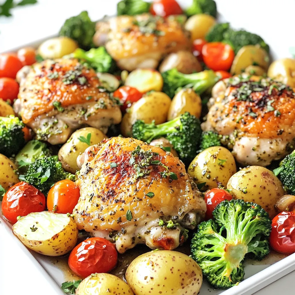 The chicken thighs are flavorful and juicy. They cook well with the veggies. Baby potatoes add a nice texture. Broccoli florets offer crunch and color. Cherry tomatoes bring sweetness. The red bell pepper adds a pop of brightness. Garlic gives that tasty punch.