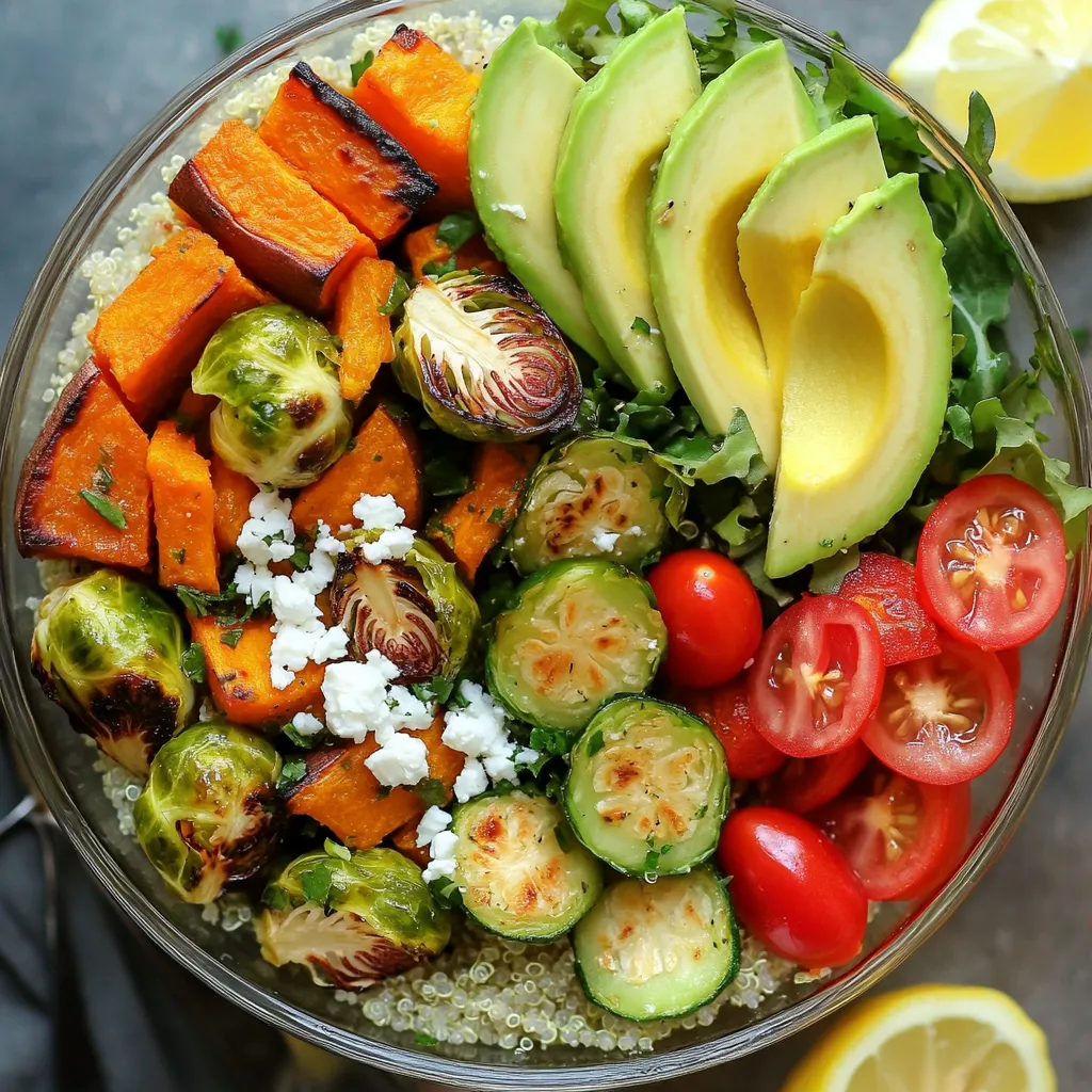 Once the veggies are roasted, let them cool slightly. To assemble your bowls, start with a base of the fluffy quinoa. Top it generously with the roasted vegetables. Then, add a handful of mixed greens, which can be spinach, arugula, or baby greens. Slice an avocado and place it on top. If you like, sprinkle ¼ cup of crumbled feta cheese over the bowl. Serve with lemon wedges on the side to add a zesty touch. Enjoy your vibrant, healthy meal!